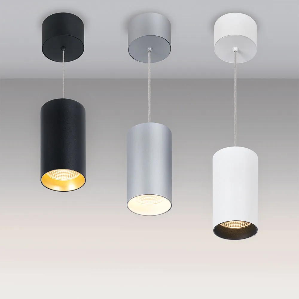 Подвесной светильник 15Вт, черный круглый корпус, белая вставка, металл. Цвет ТЕПЛЫЙ БЕЛЫЙ 3000K, св.поток 1100лм, CRI(Ra)>80, угол 40°. Размер Ø85x155мм. Встроенный драйвер PRI:220-240VAC, SEC:DC 500mA 23-36V 15Вт.