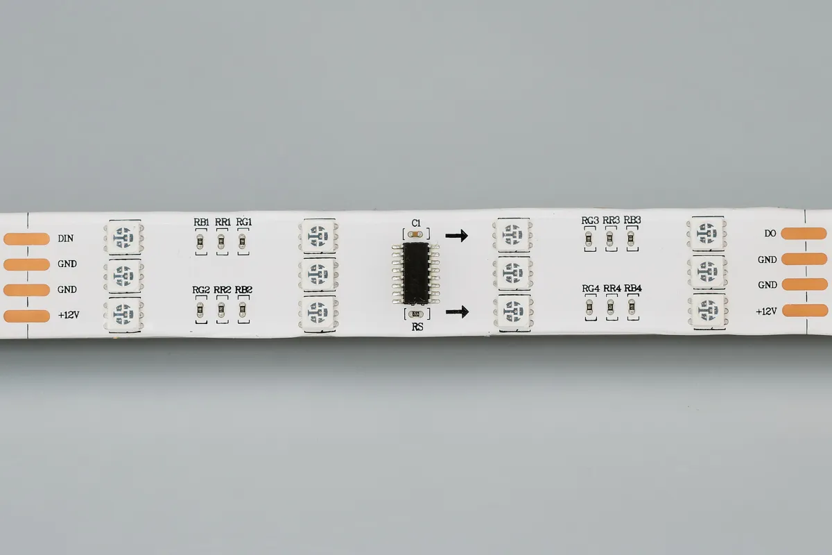 Гибкая трехрядная герметичная лента "Бегущие огни" с драйвером 1812, покрытие Silicone glue (IP65) - для применения в сухих и влажных помещениях. Длина 5м, 480шт LED RGB 5060, 32 pixel/m (1 pixel = 3 LED в одном столбце). Питание 12V, ном. мощн.12,8 Вт/м, макс. мощн-ть 16 Вт/м (статический белый цвет). Необходима подводка пит-я с 2 сторон ленты. Ширина 20 мм. Негерметичные ПРЯМОУГОЛЬНЫЕ коннекторы.