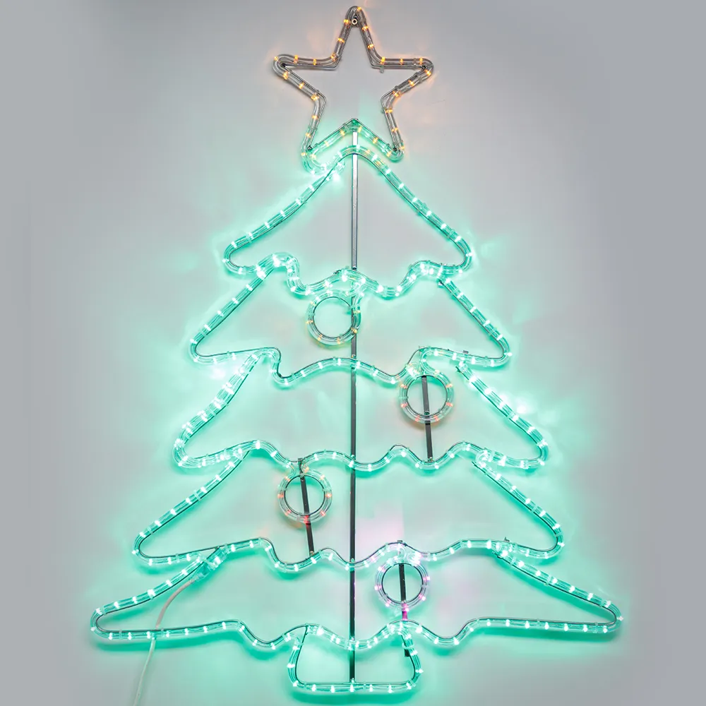 Светодиодная фигура НОВОГОДНЯЯ ЕЛЬ. Размер 1000x770 мм. Цвет светодиодов ЗЕЛЕНЫЙ / ЖЕЛТЫЙ / КРАСНЫЙ, постоянное свечение. 432 светодиода. Напряжение питания 230 В, потребляемая мощность 165 Вт, степень пылевлагозащиты IP65. Фигура укомплектована проводом питания для подключения к сети 230 В (без вилки питания).