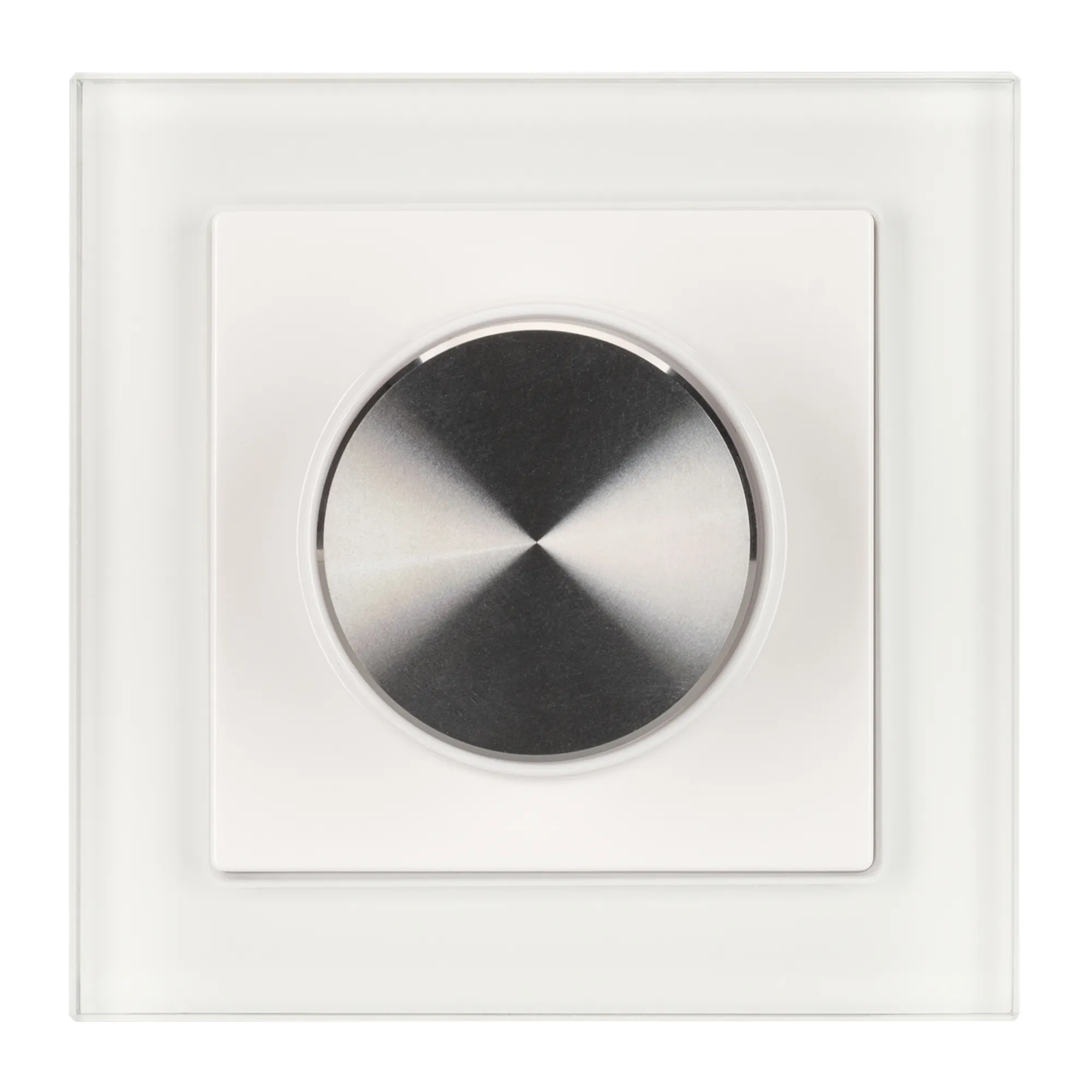 Встраиваемая роторная белая стеклянная панель для работы по протоколу DALI. Диммирование и управления цветом свечения (RGB) 1 группы или широковещательное (broadcast). Поддержка DT8, при адресации 3 каналов (R+G+B) на 1 адрес. Установка номера группы выполняется переключателями на корпусе. Подсветка регулятора во включенном состоянии. Питание от шины DALI (4 мА). Стандартная рамка входит в комплект поставки.