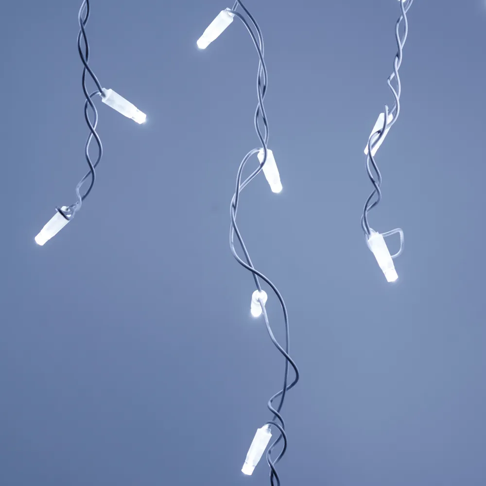 Светодиодная бахрома Pro. Размер 4000 мм (длина 4000 мм, по длине 32 нити высотой 200/600 мм). Количество светодиодов 128 шт размером 7 мм. Основной цвет свечения БЕЛЫЙ (6000 К), эффект мерцания редких точек БЕЛЫЙ (6000К) с резким световым рисунком (прозрачная вогнутая линза), соотношение светодиодов: 106 белых постоянного свечения / 22 белых с мерцанием. Эффект частого мерцания. Провод белый, каучук. Питание 230 В, Мощность 6 Вт, защита IP65, применение на улице под навесом. Аксессуары для подключения приобретаются отдельно.