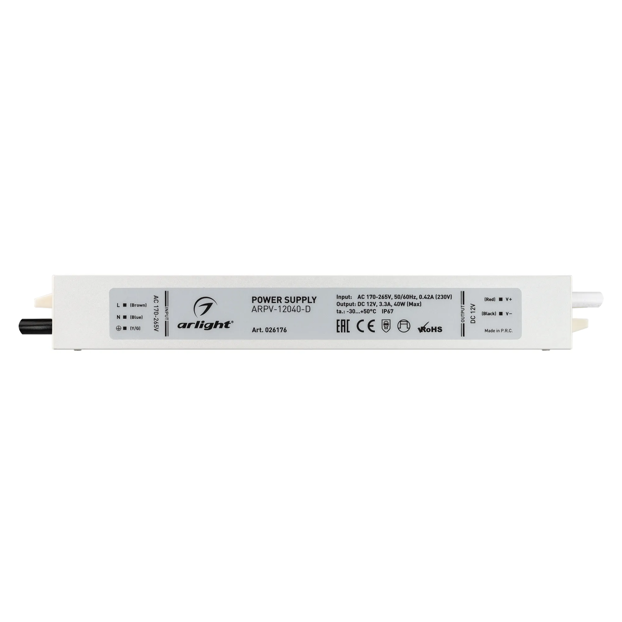 Источник напряжения с гальванической развязкой для светодиодных изделий. Входное напряжение 170-265 VAC. Выходные параметры: 12 В, 3,3 А, 40 Вт. Встроенный PFC >0,5. Герметичный алюминиевый корпус IP 67. Рабочая температура -30…+50C⁰. Габаритные размеры длина 217 мм, ширина 30 мм, высота 20 мм. Гарантийный срок 3 года.