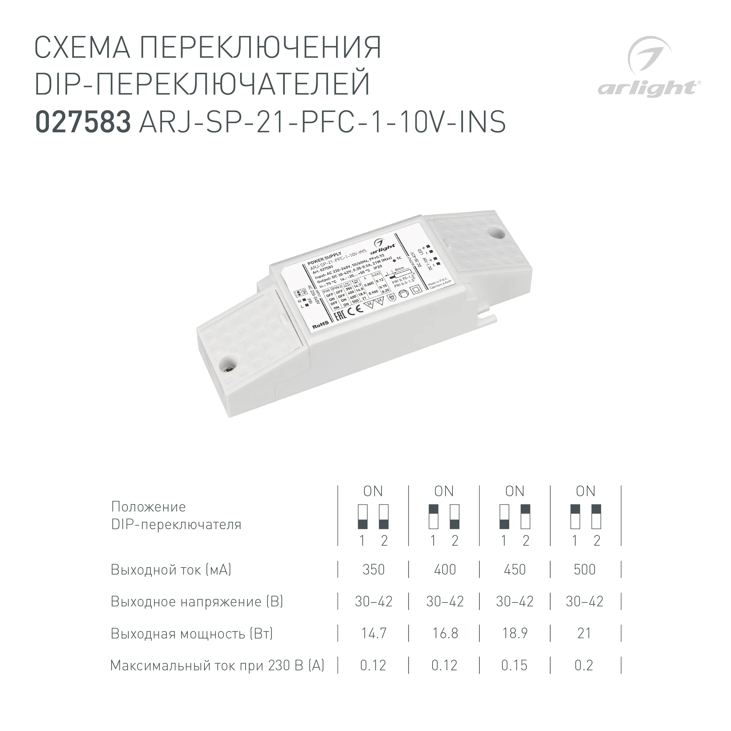 Блок питания ARJ-SP-21-PFC-1-10V-INS (21W, 350-500mA) (Arlight, IP20 Пластик, 5 лет)