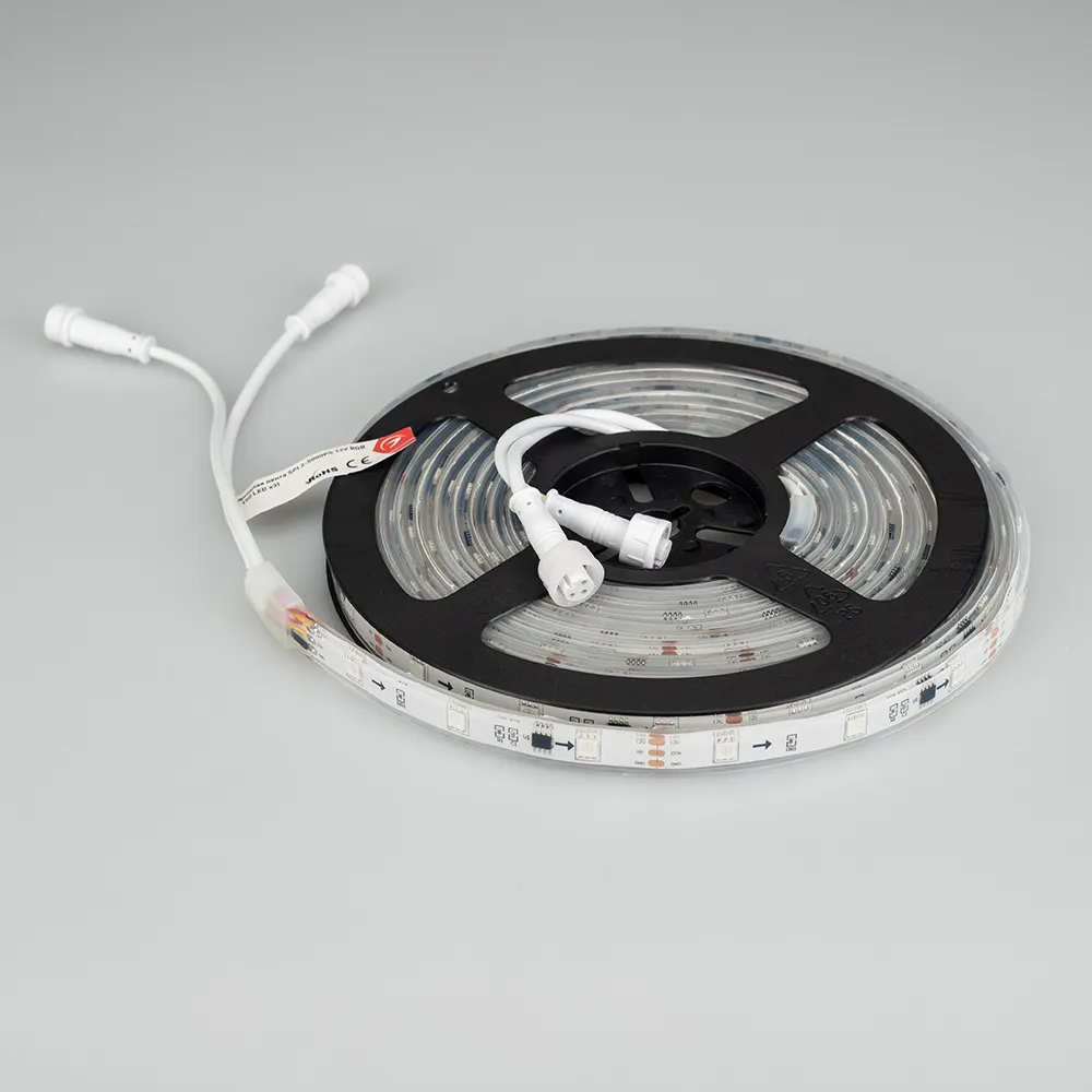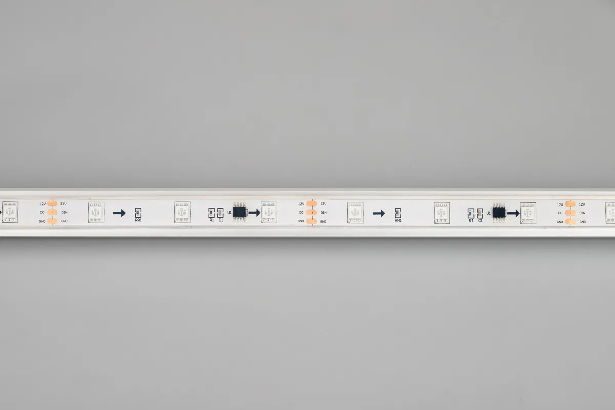 Герметичная лента «Бегущие огни» с драйвером 16703, в запрессованном силиконе, литая силиконовая трубка IP67, со СКОТЧЕМ 3M на обрат. стороне. Длина 5м, 150шт LED RGB 5060, 10 pixel/m (1 pixel = 3 LED). Управление от внешнего контроллера SPI, без авторежима. Питание 12V, макс. мощн-ть 7,2 Вт/м (статический белый цвет). Ширина 12 мм. Герметичные круглые коннекторы.