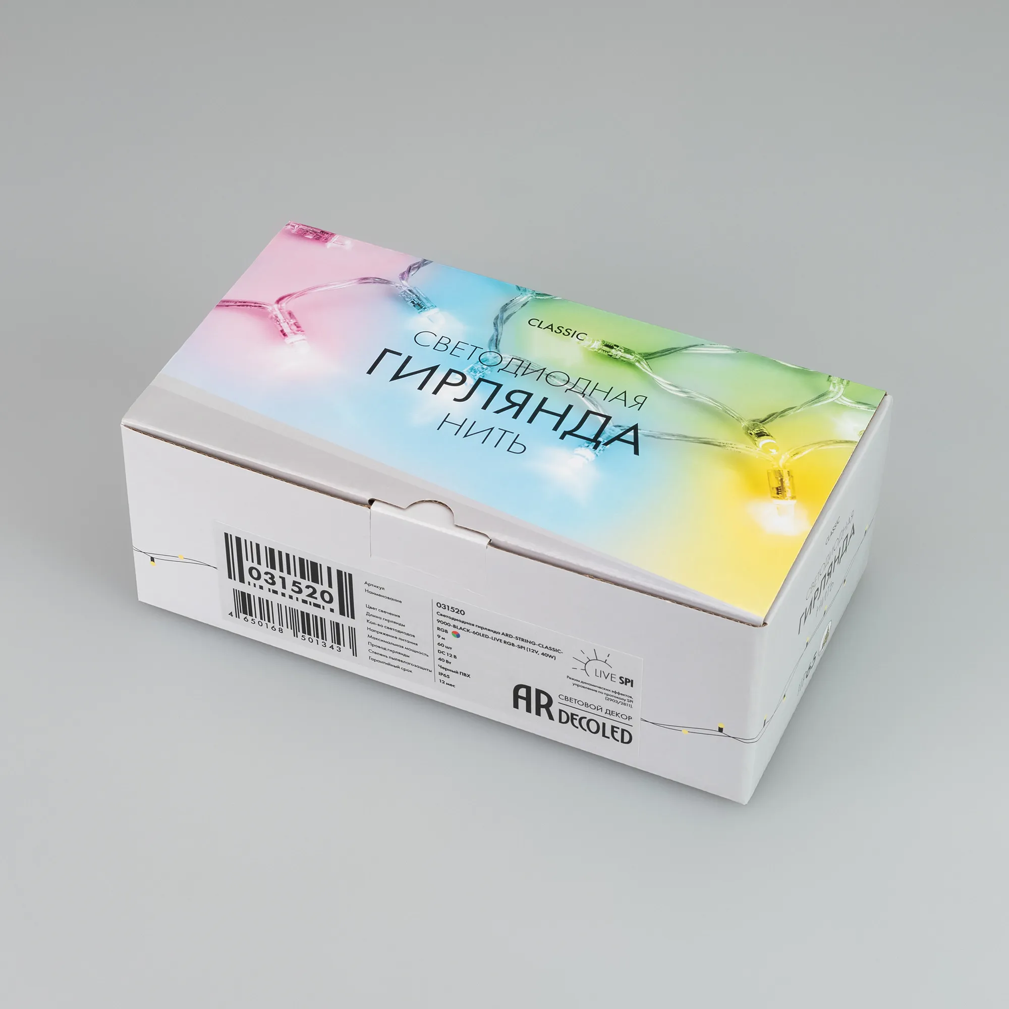 Светодиодная нить Classic. Размер 9000 мм. Цвет свечения RGB, 60 светодиодов размером 7 мм с динамическими и статическими эффектами свечения с мягким световым рисунком (прозрачная выпуклая линза), управление по протоколу SPI. Смена эффектов и управление осуществляется с помощью контроллера с пультом. Провод черный, ПВХ. Питание 12В, Мощность 26 Вт, защита IP65, применение в помещении и на улице под навесом. Аксессуары для подключения и управления приобретаются отдельно. Для эксплуатации и управления необходимо приобрести аксессуар для подключения и SPI контроллер (см.совместимые).