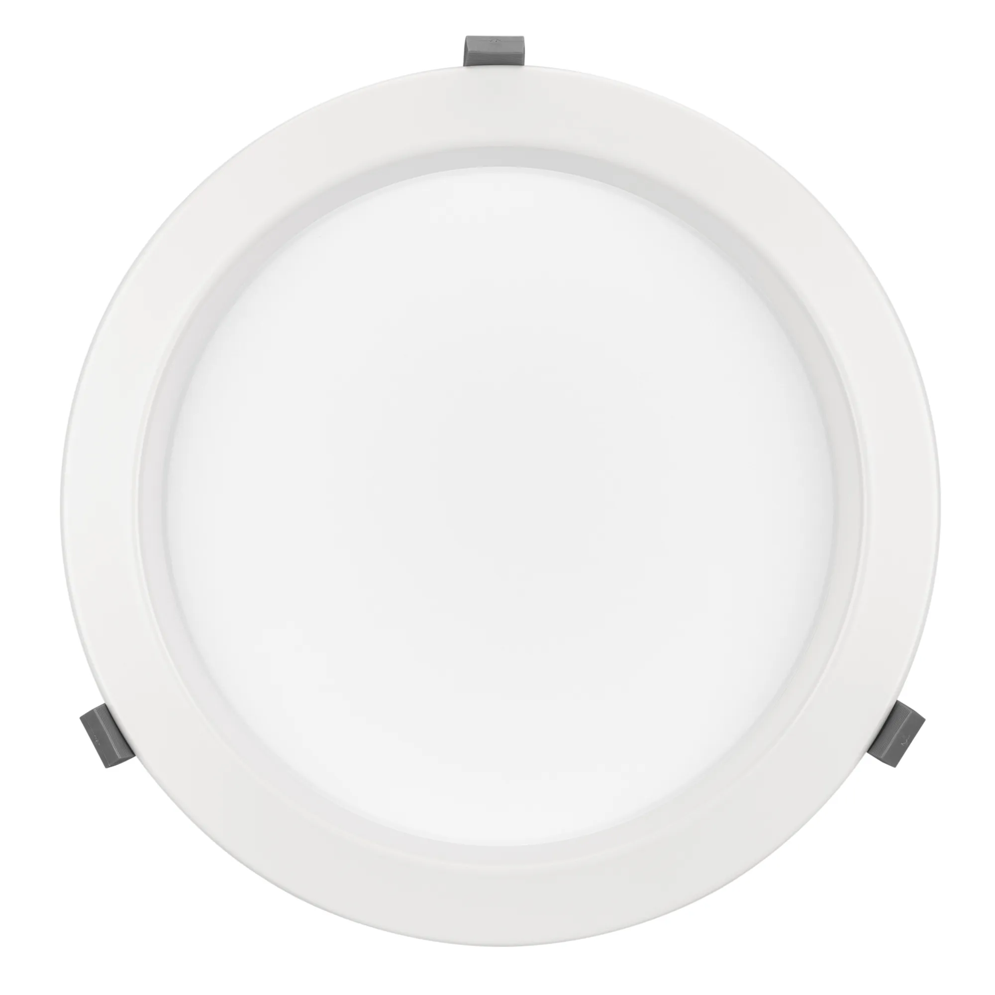 Встраиваемый светильник "Даунлайт" 40Вт. Цвет свечения БЕЛЫЙ 6000К, или ДНЕВНОЙ 4000К, или ТЕПЛЫЙ 3000К, выбор цвета свечения при установке, фиксированный. Световой поток 3600-3880лм, угол 90°, CRI>80. Белый корпус. Питание AC220-240V. Габариты: Ø280х94мм, врезное отверстие Ø240-255мм. Драйвер в комплекте (23-38.5V, 1050mA).
