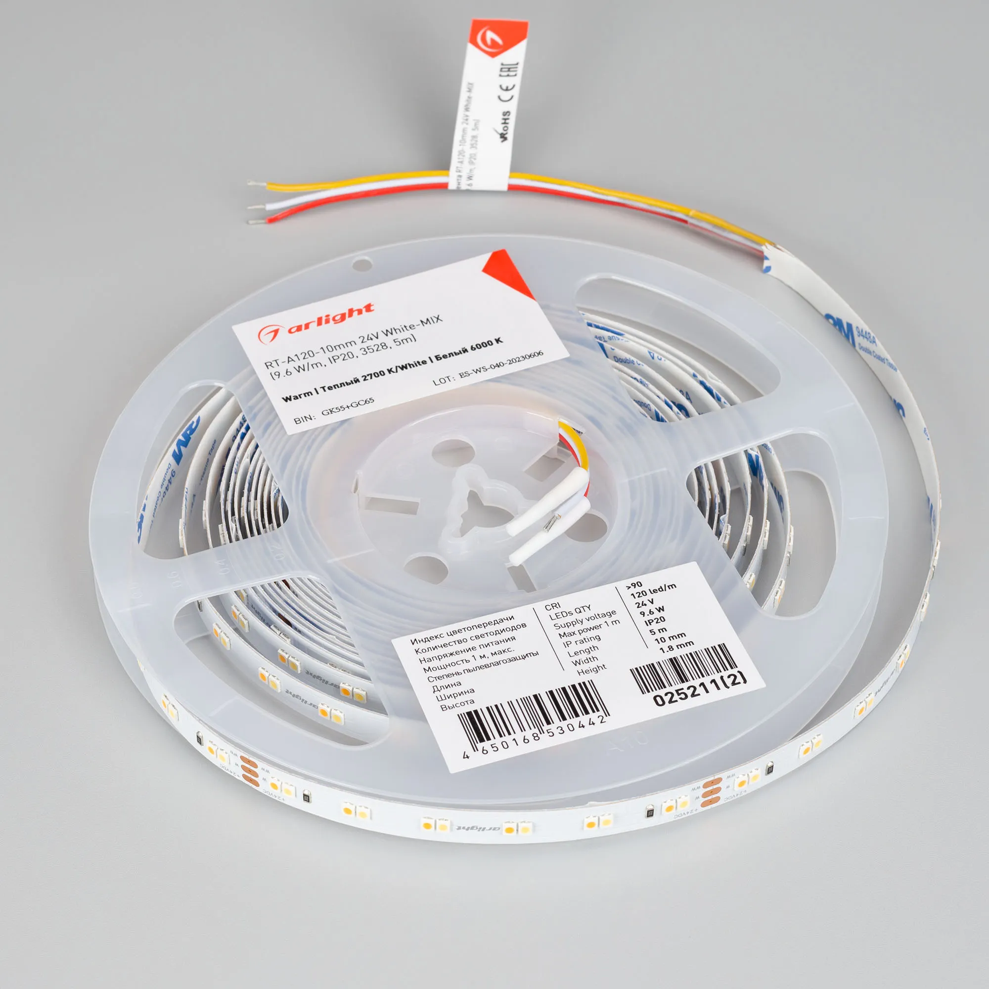 Лента светодиодная RT-A120-10mm 24V White-MIX (9.6 W/m, IP20, 3528, 5m) (Arlight, Изменяемая ЦТ)
