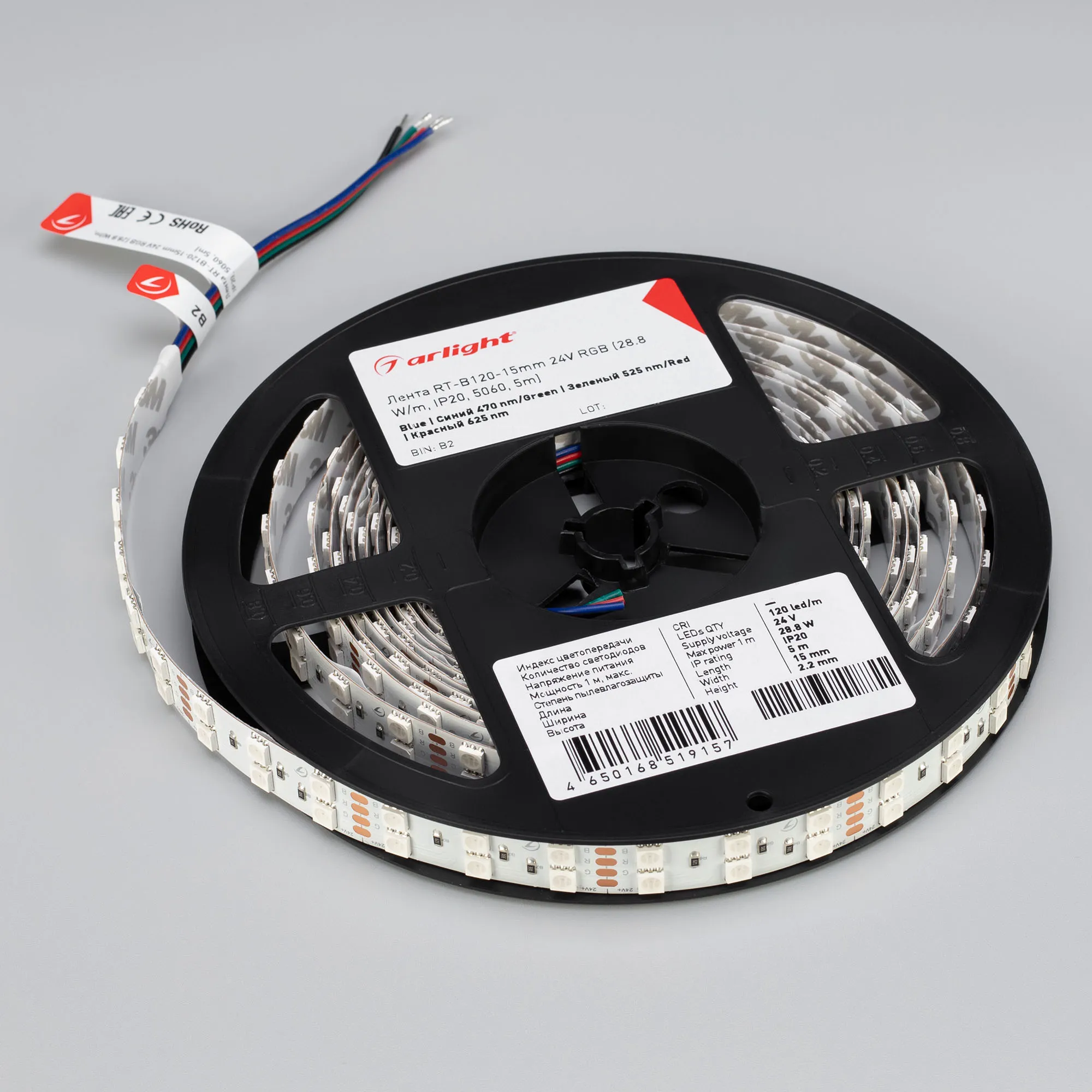 Лента светодиодная RT-B120-15mm 24V RGB (28.8 W/m, IP20, 5060, 5m) (Arlight, Открытый)