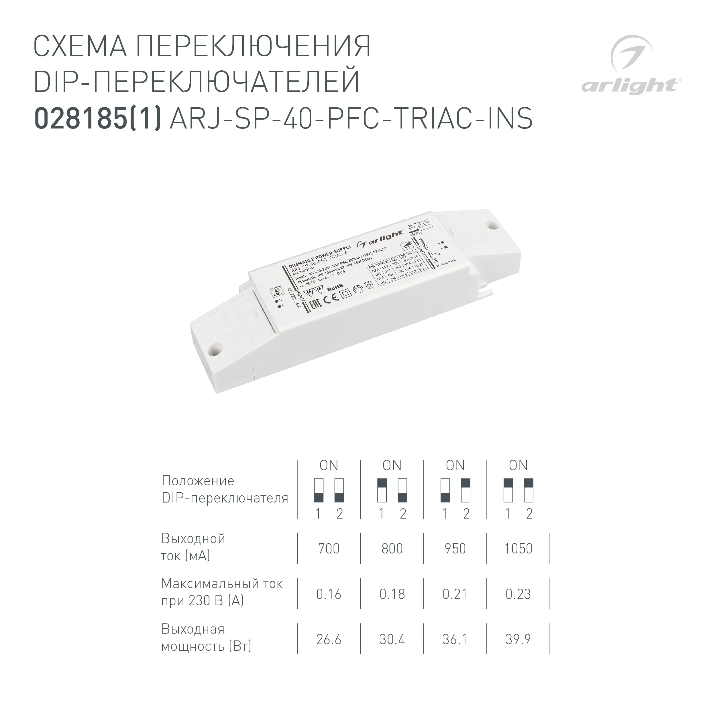 Блок питания ARJ-SP-40-PFC-TRIAC-INS (40W, 27-38V, 0.7-1.05A) (Arlight, IP20 Пластик, 5 лет)