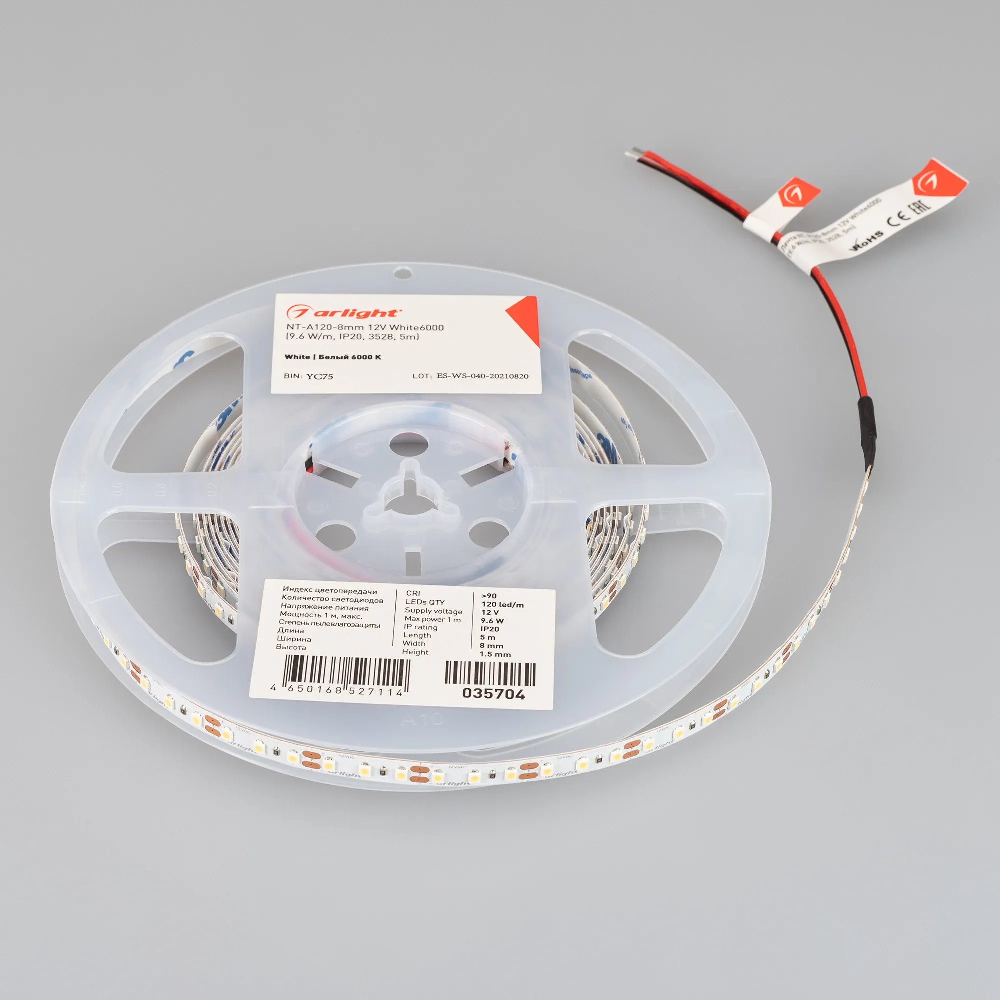 Светодиодная лента NT серии A120. Светодиоды SMD 3528, 120 шт/м, белая плата шириной 8 мм, скотч 3M. Цвет БЕЛЫЙ 6000K, индекс цветопередачи CRI>90, угол 120°. Питание 12 В, мощность 9.6 Вт/м (48 Вт на 5 м). Размеры 5000x8x1.5 мм. Мин. отрезок 25 мм, 3 светодиода. Цена за 1 м.