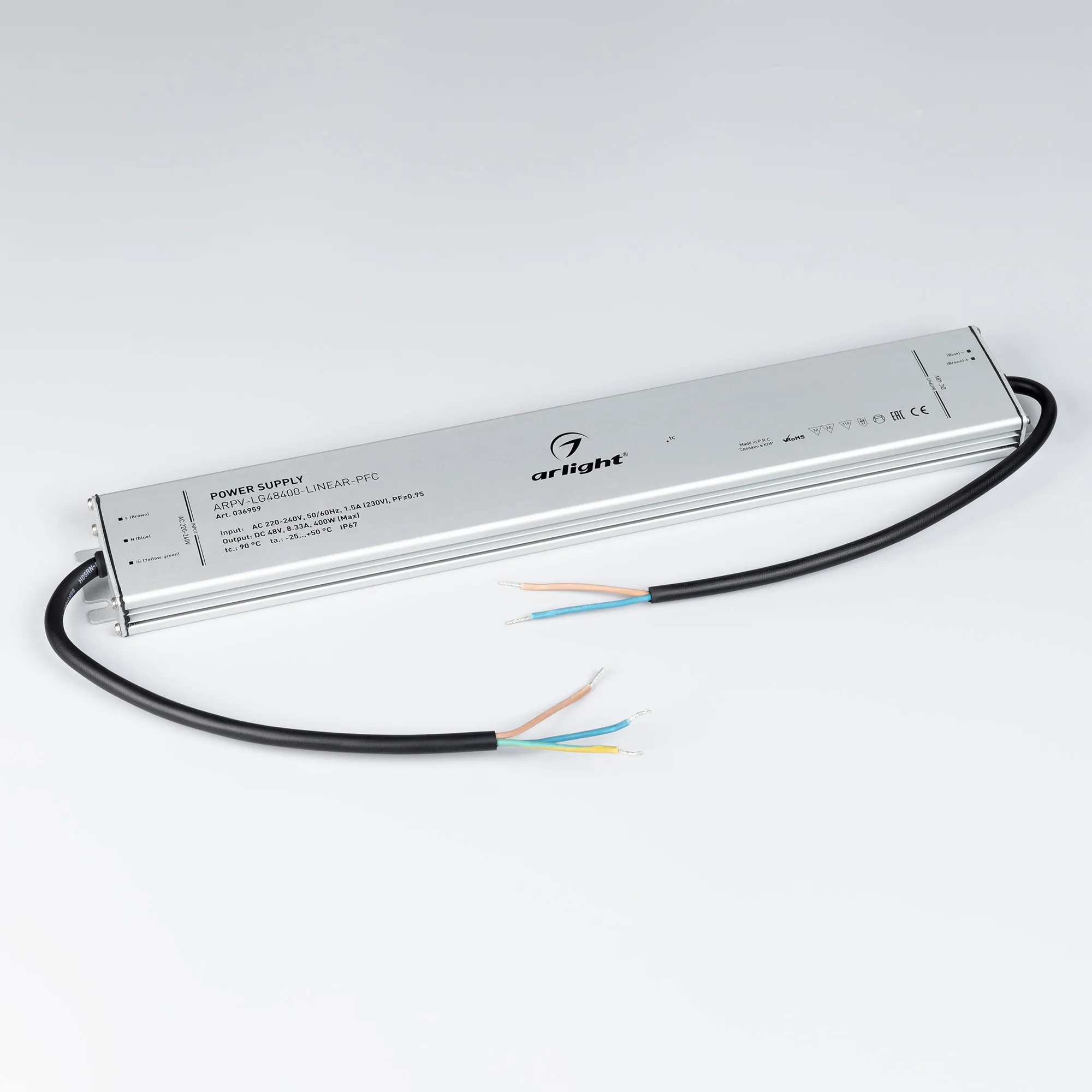 Источник напряжения с гальванической развязкой для светодиодных изделий. Входное напряжение 220-240 VAC. Выходные параметры: 48 В, 8.33 А, 400 Вт. Встроенный PFC >0.95. Тонкий металлический корпус IP67. Вход: 220-240VAC. Выход: 48VDC. Размер 400х60х22 mm.. Совместимость со стандартом EMC. Гарантия 5 лет. Допускается использование только внутри помещений.