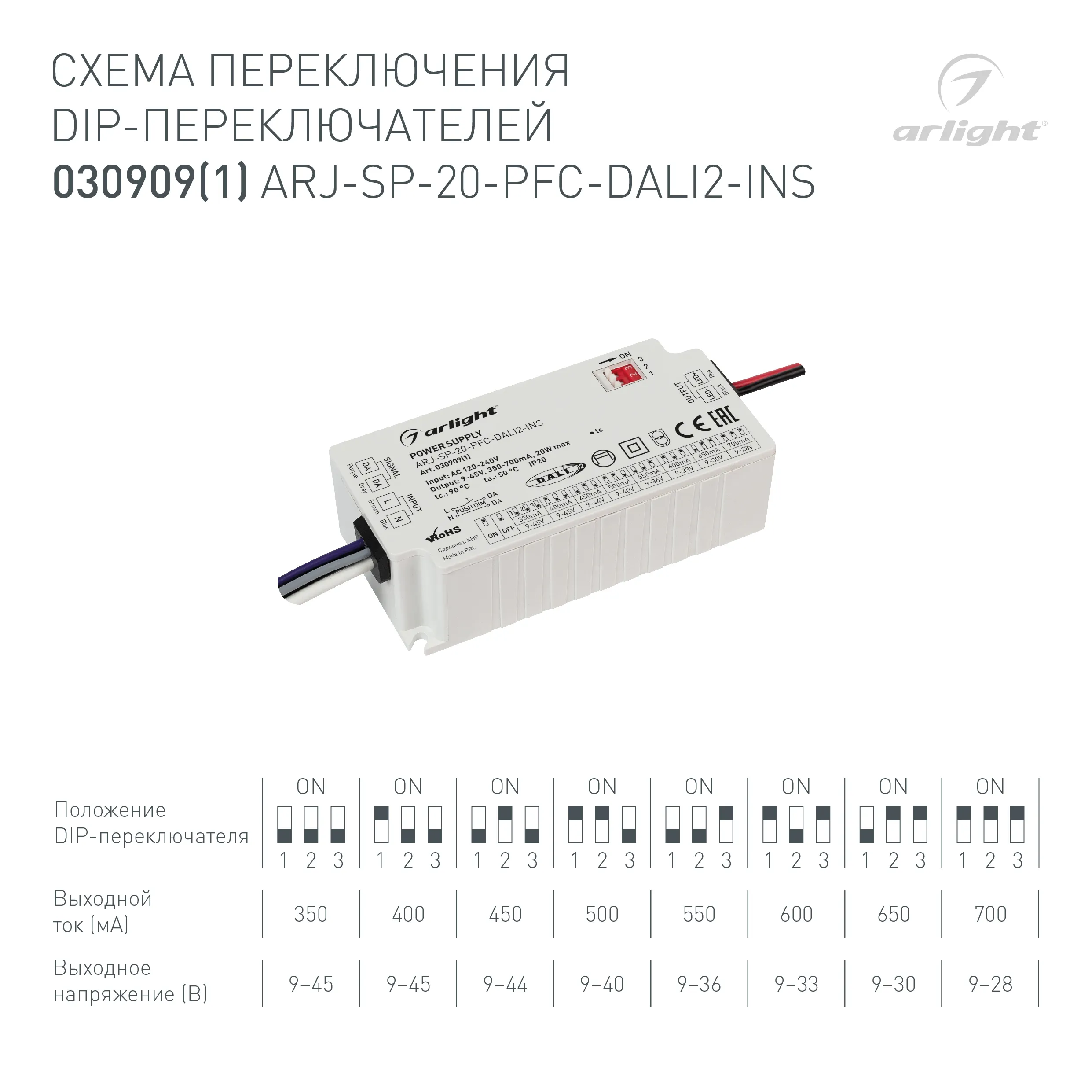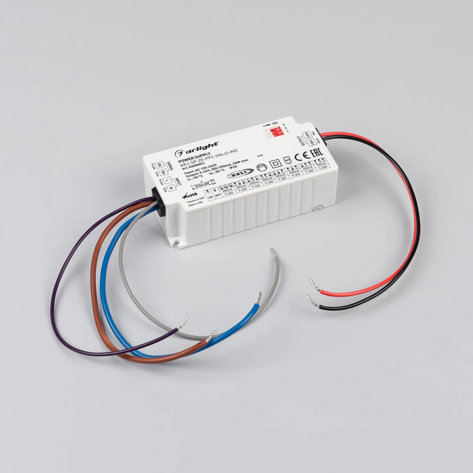 Блок питания ARJ-SP-20-PFC-DALI2-INS (20W, 9-45V, 0.35-0.7A) (Arlight, IP20 Пластик, 5 лет)