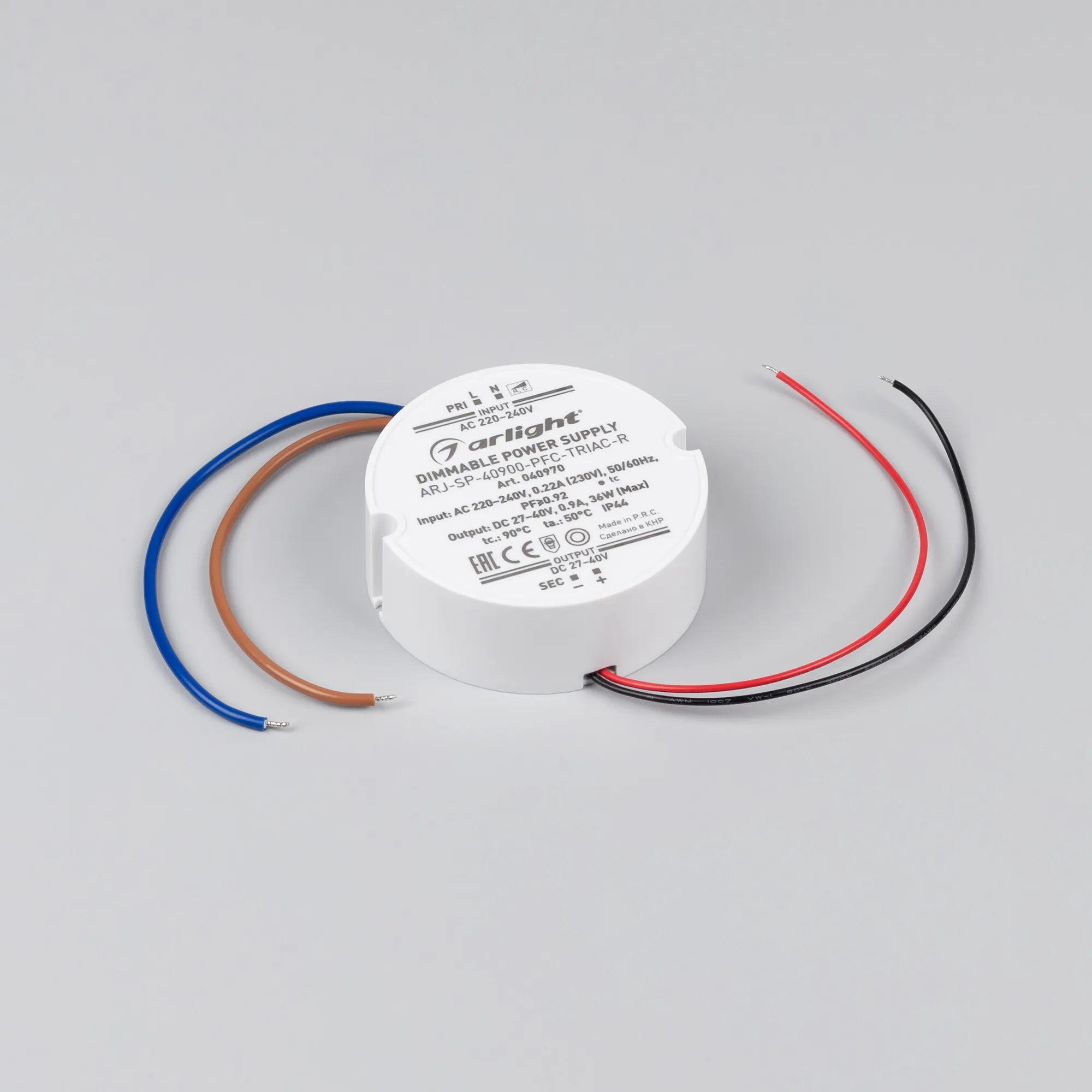 Диммируемый источник тока по стандарту TRIAC с гальванической развязкой для светильников и мощных светодиодов. Входное напряжение 220-240 VAC. Выходные параметры: 27-40 В, 900 mА, 36 Вт. Встроенный PFC >0,92. Негерметичный пластиковый корпус IP 44. Габаритные размеры диаметр в окружности Ø70 мм, высота 25 мм. Гарантийный срок 5 лет.
