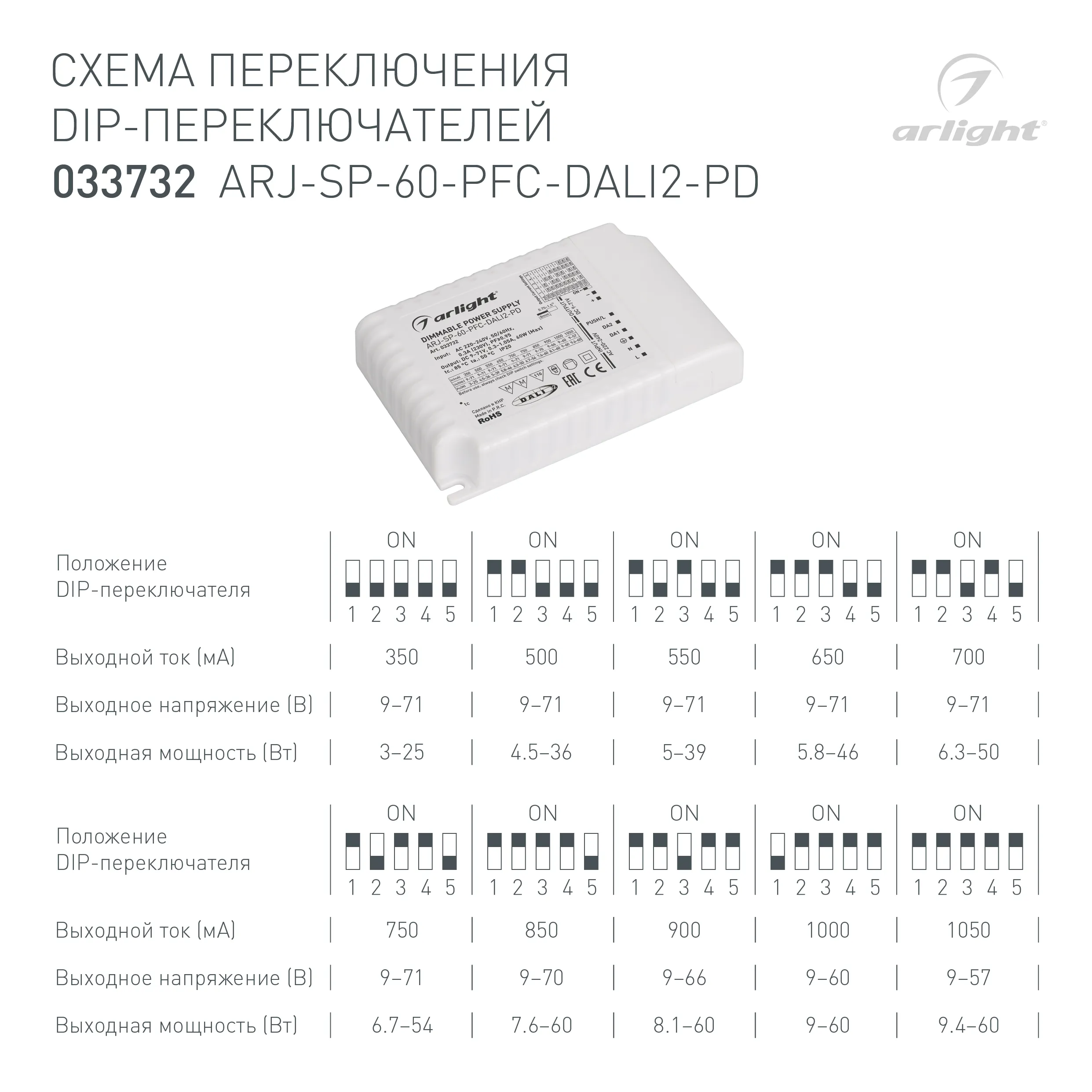 Блок питания ARJ-SP-60-PFC-DALI2-PD (60W, 9-71V, 0.35 -1.05A) (Arlight, IP20 Пластик, 5 лет)