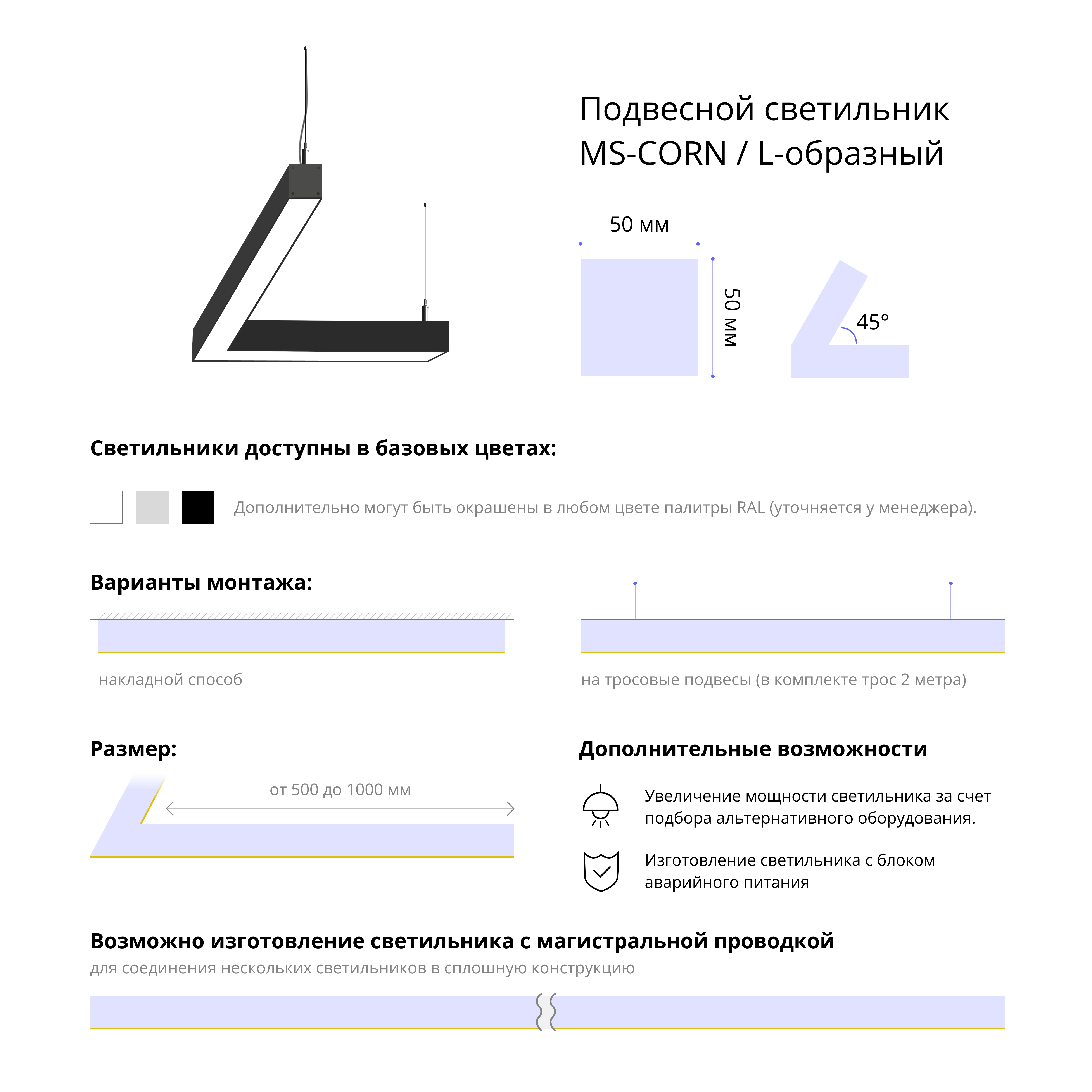 Светодиодный фигурный светильник MS-CORN L-образный 45гр. размер профиля 50х50мм длиной 500х500мм мощностью 40W. Светильник собирается в алюминиевом корпусе с матовым рассеивателем, который дает равномерную засветку по всей площади.