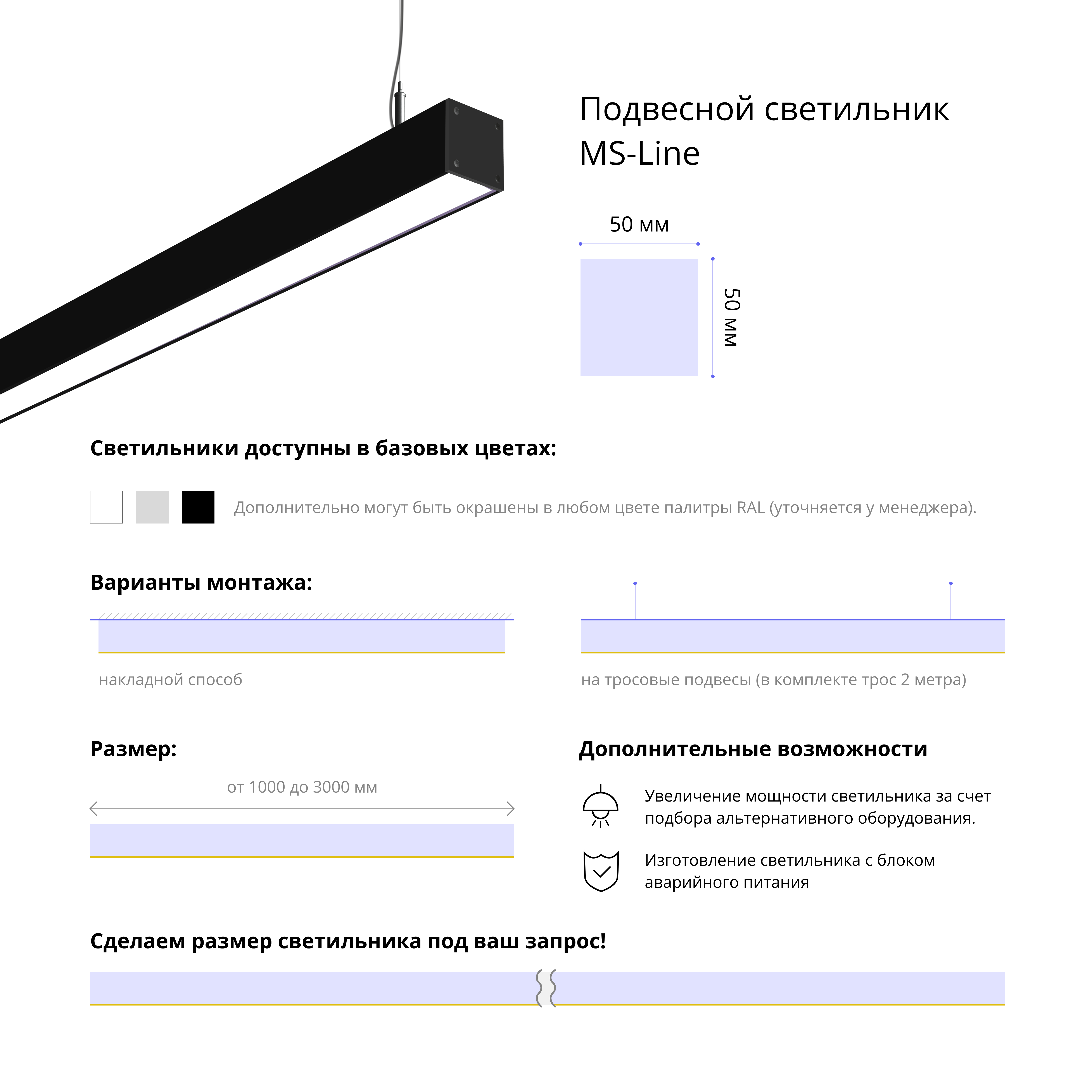Светодиодный линейный светильник MS-LINEAR Линейный размер профиля 50x50мм длиной 2500мм мощностью 50W. Светильник собирается в алюминиевом корпусе с матовым рассеивателем, который дает равномерную засветку по всей площади.