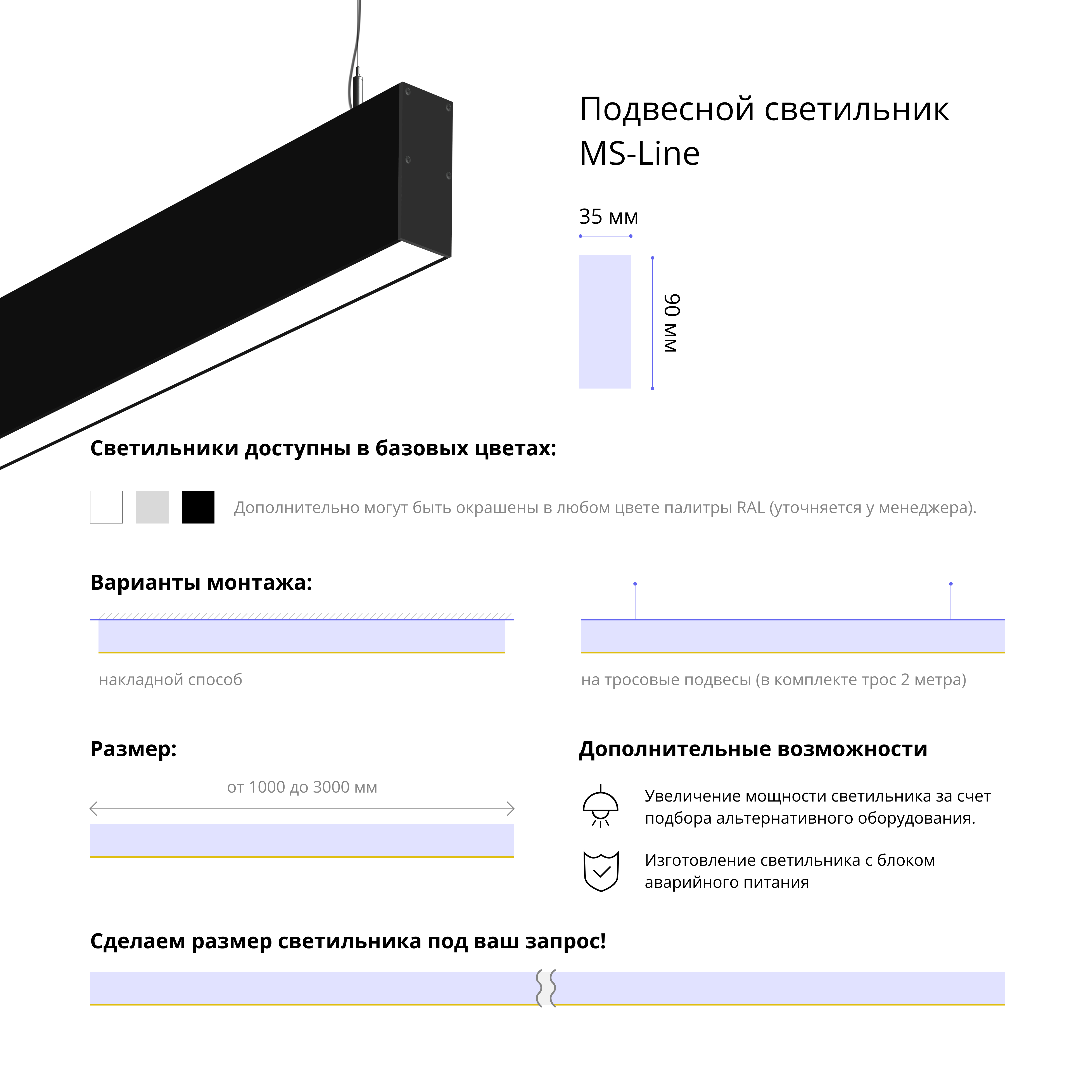 Подвесной светильник MS-LINEAR Линейный размер профиля 90х35мм длиной 1000мм мощностью 40W. Светильник собирается в алюминиевом корпусе с матовым рассеивателем, который дает равномерную засветку по всей площади.