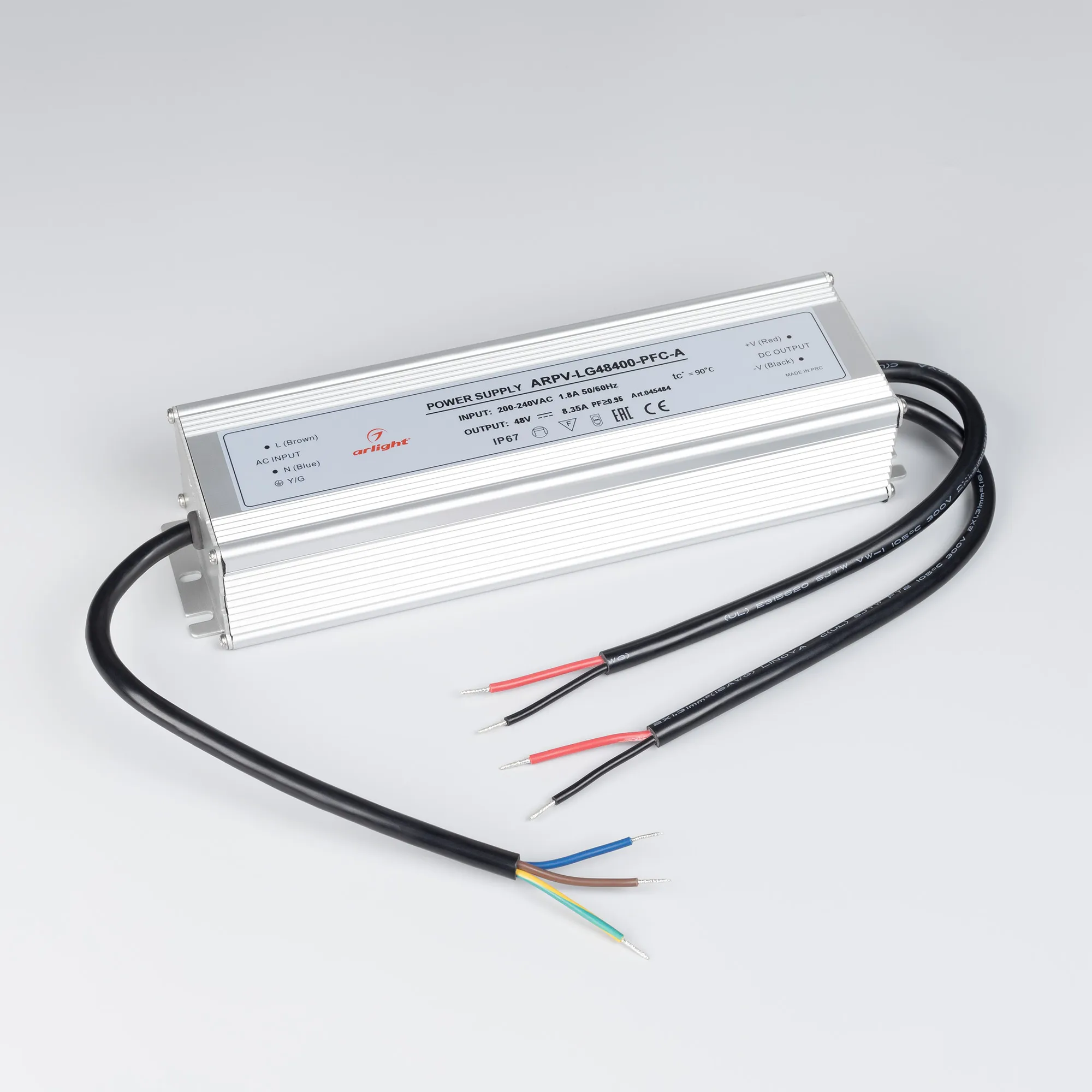 Источник напряжения с гальванической развязкой для светодиодных изделий. Входное напряжение 200-240 VAC. Выходные параметры: 48 В, 8.3 А, 400 Вт. Встроенный PFC >0,95. Герметичный алюминиевый корпус IP 67. Рабочая температура -40…+70C⁰. Габаритные размеры длина 258 мм, ширина 74 мм, высота 46 мм. Гарантийный срок 5 лет.