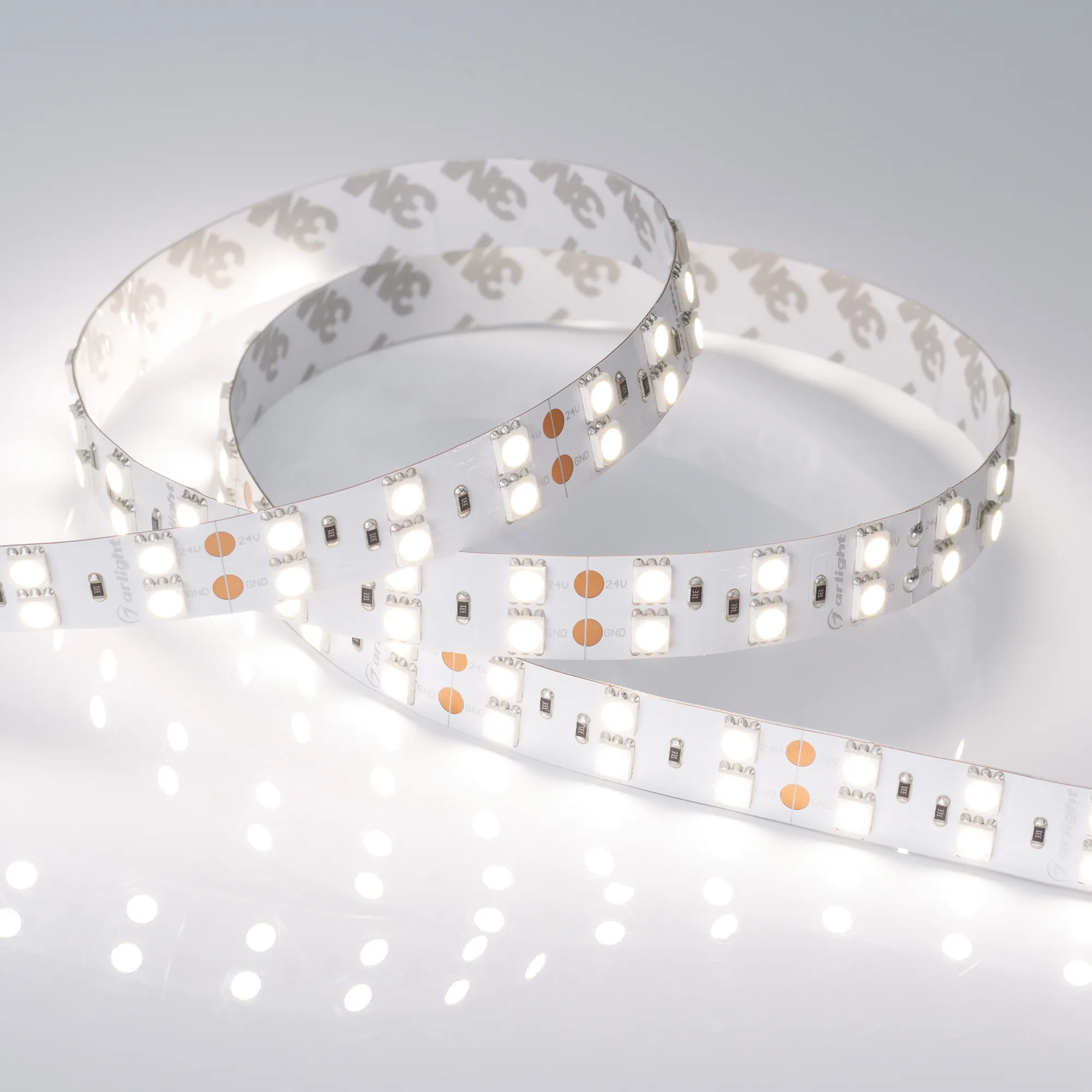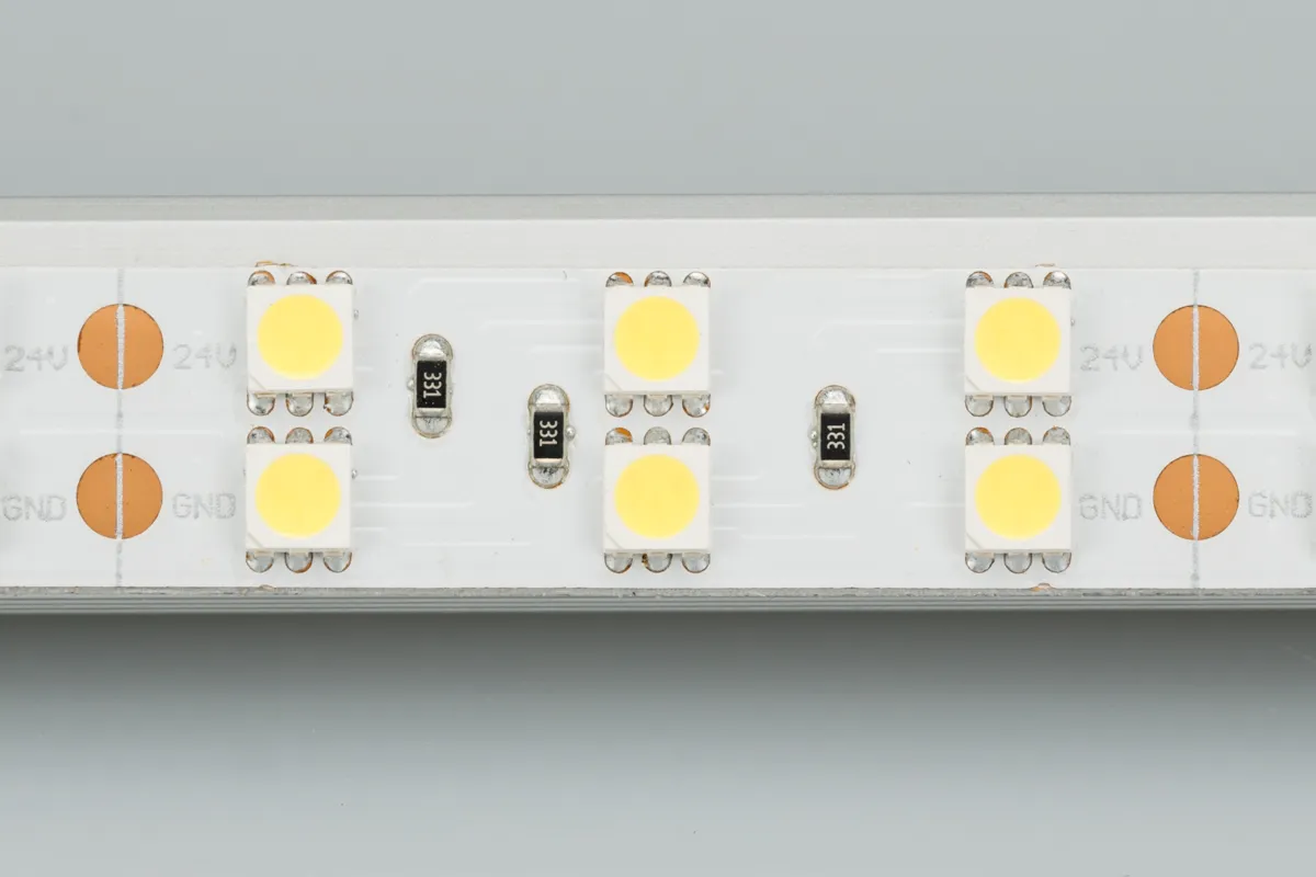Гибкая лента LUX, 2 ряда светодиодов smd 5060, 120шт/м (600шт на 5м), белая плата 15мм, скотч 3М. Цвет ДНЕВНОЙ 3800-4200K. Питание 24V, мощность 28.8 Вт/м (144 Вт на 5м), угол 120°, цветопередача CRI>85. Размеры 5000х15х2.2мм. Мин.отрезок 50мм, 6 светодиодов. Цена за 1м.