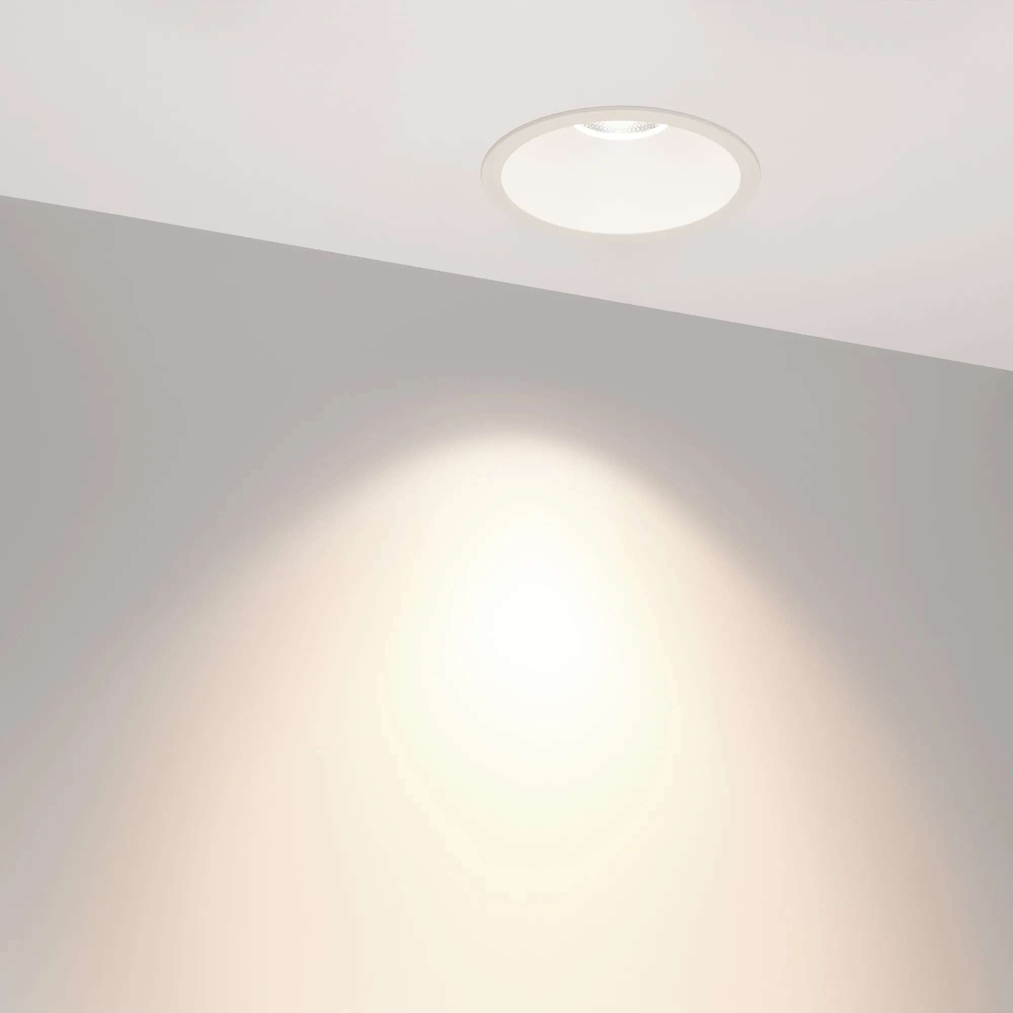 Встраиваемый светильник даунлайт. Мощность 20 Вт, св. поток 1810 лм, 90 лм/Вт, дневной 4000 K, CRI>90, угол 50°, напряжение питания 230 В. Белый круглый корпус из алюминия, степень защиты IP20. Размер: диаметр 123 мм, высота 68 мм. Монтаж встраиваемый, установочное отверстие: диаметр 110 мм. UGR<14. Драйвер 27-42 В, 500 мА, пульсация <2%.