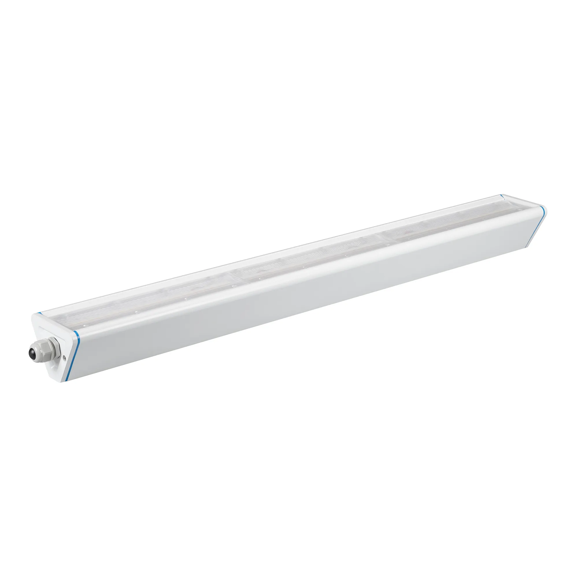 Линейный светильник для освещения складских и промышленных помещений. Мощность 150 W, напряжение питания AC 110-277V/50Hz.CRI80. Управление 1-10В. Тип светодиодов SMD2835, с групповой оптической линзой. Цвет свечения ДНЕВНОЙ 5000K, световой поток 22000 Lm, угол рассеивания 50*90°. Цвет корпуса белый, степень пылевлагозащиты IP65. Степень ударопрочности IK08. Габариты 885х105х83 mm. В светильнике присутствует функция защиты от удара молнии. Есть сквозная проводка. Комплект подвеса и крепление для накладного монтажа в КОМПЛЕКТЕ. Датчик движения работает до 10.5м.