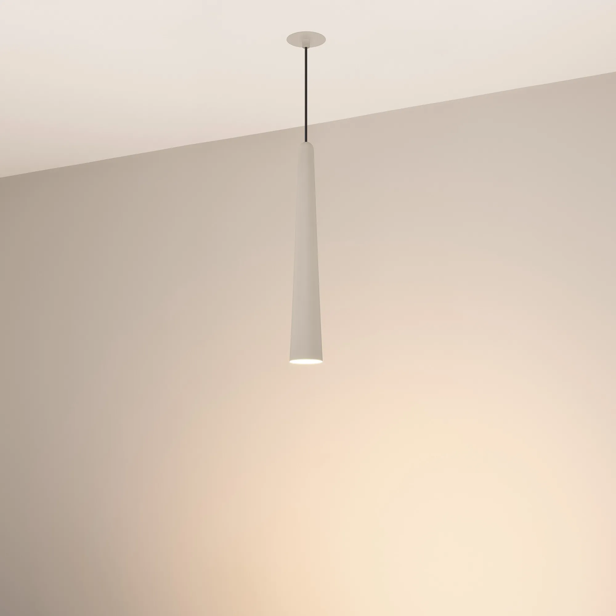 Подвесной светильник. Мощность 5 Вт, св. поток 400 лм, световая эффективность 70 лм/Вт, теплый 3000K, CRI>92, угол 36°, напряжение питания 230 В. Светло - серый конусообразный вытянутый корпус из алюминия, линза из PMMA, степень защиты IP20. Размер: диаметр 57 мм, высота 400 мм. Монтаж подвесной, длина подвеса 2000 мм, регулируемая. В комплекте 2 вида чаш. Габариты встраиваемой чаши: Ø 80x41 мм. Габариты накладной чаши Ø80x60 мм. Драйвер 2,8-12В, 500 мА, пульсация <1%.