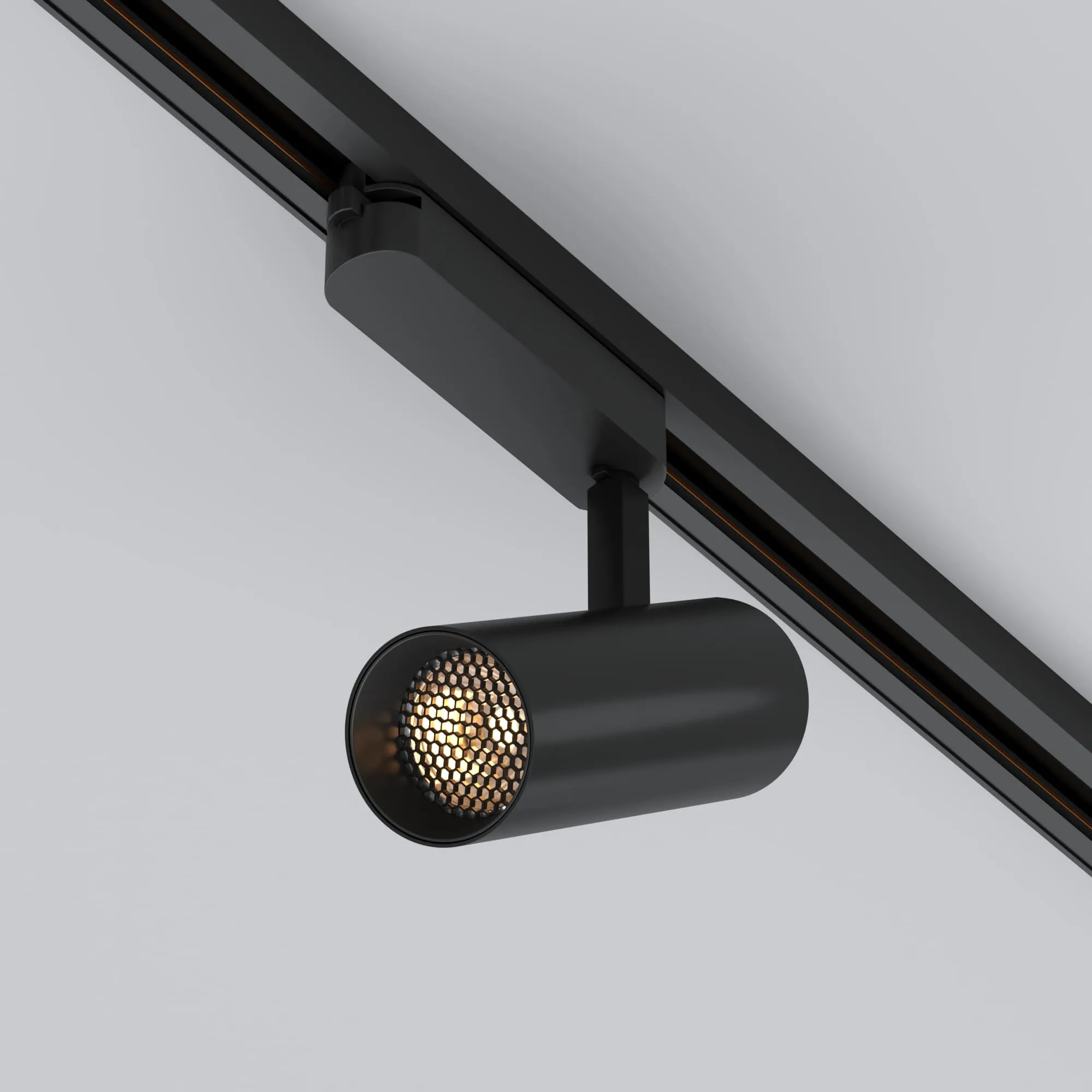 Светильник для треков/шин 2 провода. Мощность 10 Вт, св. поток без решетки honeycomb 1000 лм, 100 лм/Вт, с решеткой honeycomb 660 лм, 66 лм/Вт, дневной 4000 K, CRI>90, угол 24°, напряжение питания 230 В. Черный круглый корпус из алюминия, материал линзы PMMA, степень защиты IP20. Размер: диаметр 55 мм, длина световой части 141 мм. Монтаж на трек 1-фазный. Драйвер встроенный 25-40 В, 250мА., пульсация <5%.