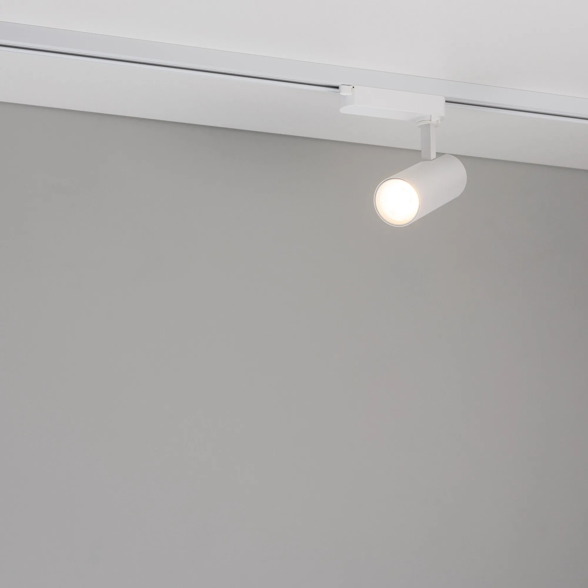 Светильник для треков/шин 2 провода. Мощность 15 Вт, св. поток без решетки honeycomb 1500 лм, 100 лм/Вт, с решеткой honeycomb 990 лм, 66 лм/Вт, тёплый 3000 K, CRI>90, угол 36°, напряжение питания 230 В. Белый круглый корпус из алюминия, материал линзы PMMA, степень защиты IP20. Размер: диаметр 60 мм, длина световой части 141 мм. Монтаж на трек 1-фазный. Драйвер встроенный 350 мА 25-40 В, пульсация <5%.