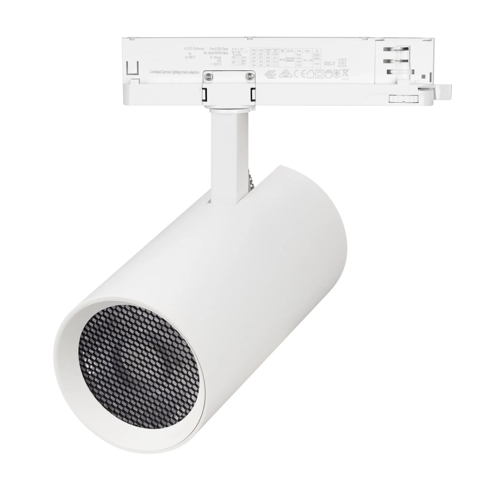 Светильник для треков/шин 4 провода. Мощность 40Вт, св. поток без решетки honeycomb 4000 лм, 100 лм/Вт, с решеткой honeycomb 2640 лм, 66 лм/Вт, дневной 4000 K, CRI>90, угол 15°, напряжение питания 230 В. Белый круглый корпус из алюминия, материал линзы PMMA, степень защиты IP20. Размер: диаметр 90 мм, длина световой части 141 мм. Монтаж на трек 3-фазный. Драйвер встроенный 24-42 В, 750мА., пульсация <5%