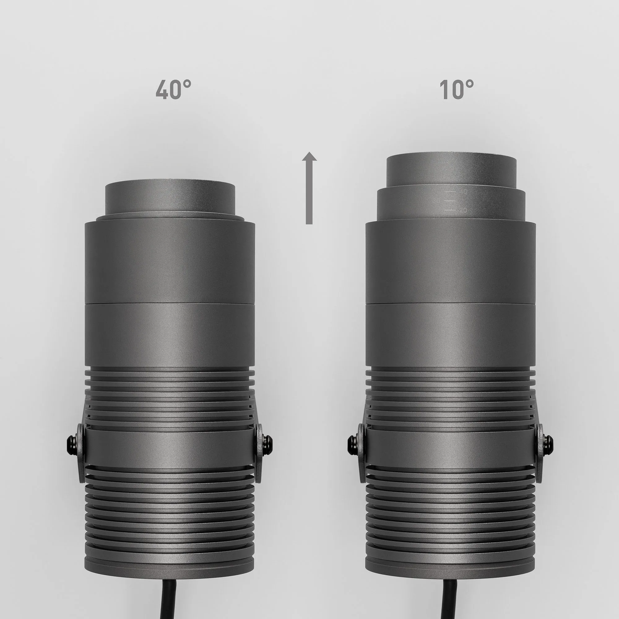 Уличный светодиодный прожектор, мощность 18Вт, регулируемый угол освещения 10-40°. Цвет ТЕПЛЫЙ 3000К, световой поток для угла 10° 500 для угла 40° 800лм. Влагозащищенный корпус IP67 - темно-серый алюминий, экран из закаленного стекла. Угол поворота корпуса в вертикальной плоскости 135°. Питание 230В, мощность 18 Вт. Размеры DxH - Ø75x150мм. В комплекте 1м провод.