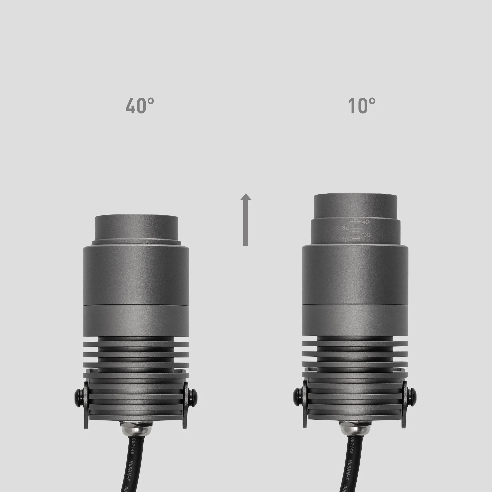 Уличный светодиодный прожектор, мощность 8Вт, регулируемый угол освещения 10-40°. Цвет ДНЕВНОЙ 4000К, световой поток для угла 10° 240 для угла 40° 420лм. Влагозащищенный корпус IP67 - темно-серый алюминий, экран из закаленного стекла. Угол поворота корпуса в вертикальной плоскости 135°. Питание 230В, мощность 8 Вт. Размеры DxH - Ø52x103мм. В комплекте 1м провод.