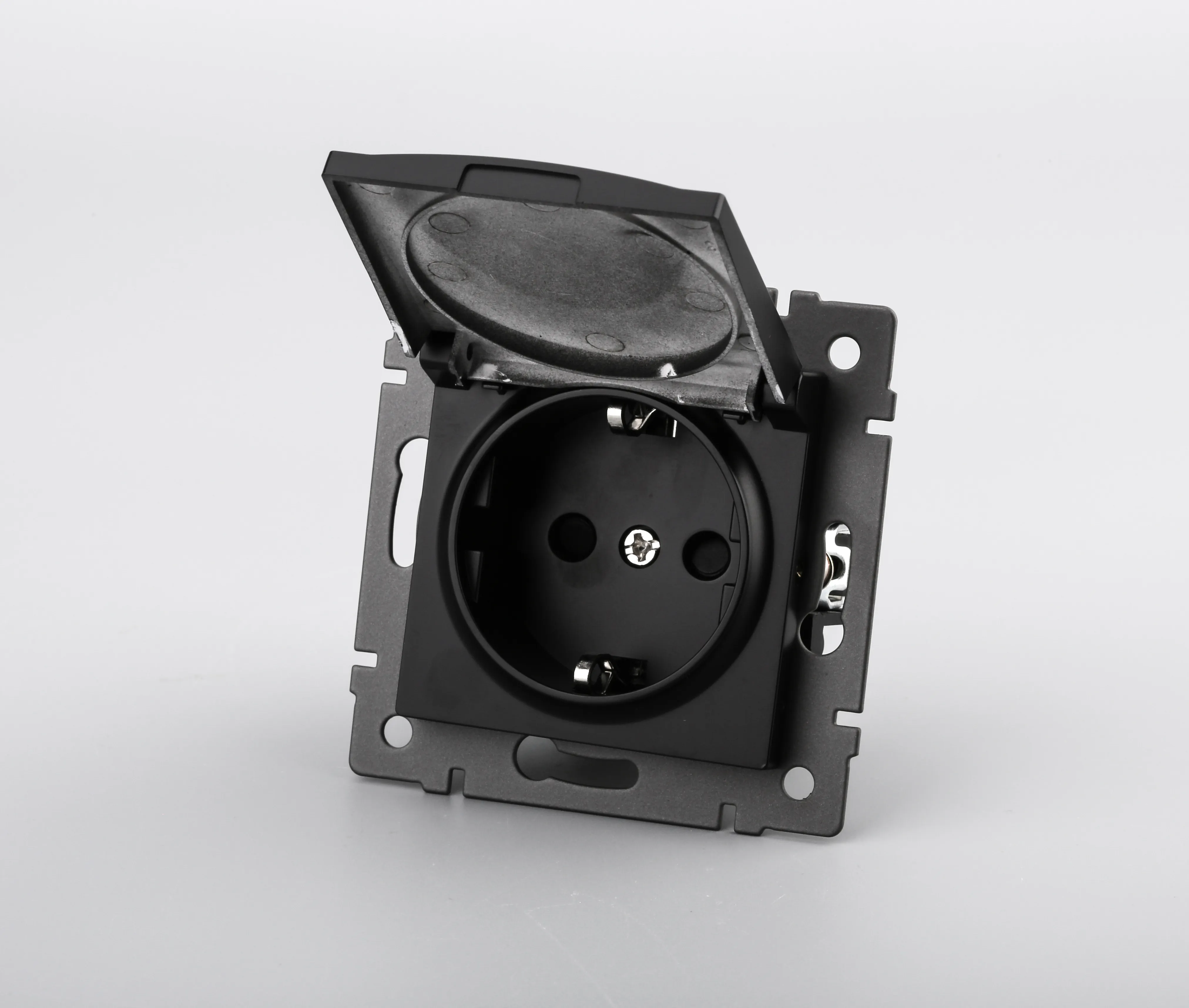 Механизм розетки с заземлением на 1 пост с влагозащитной крышкой. Цвет - черный. Без фронтальной рамки. Уровень пылевлагозащиты IP44. Устанавливается в стандартный подрозетник.