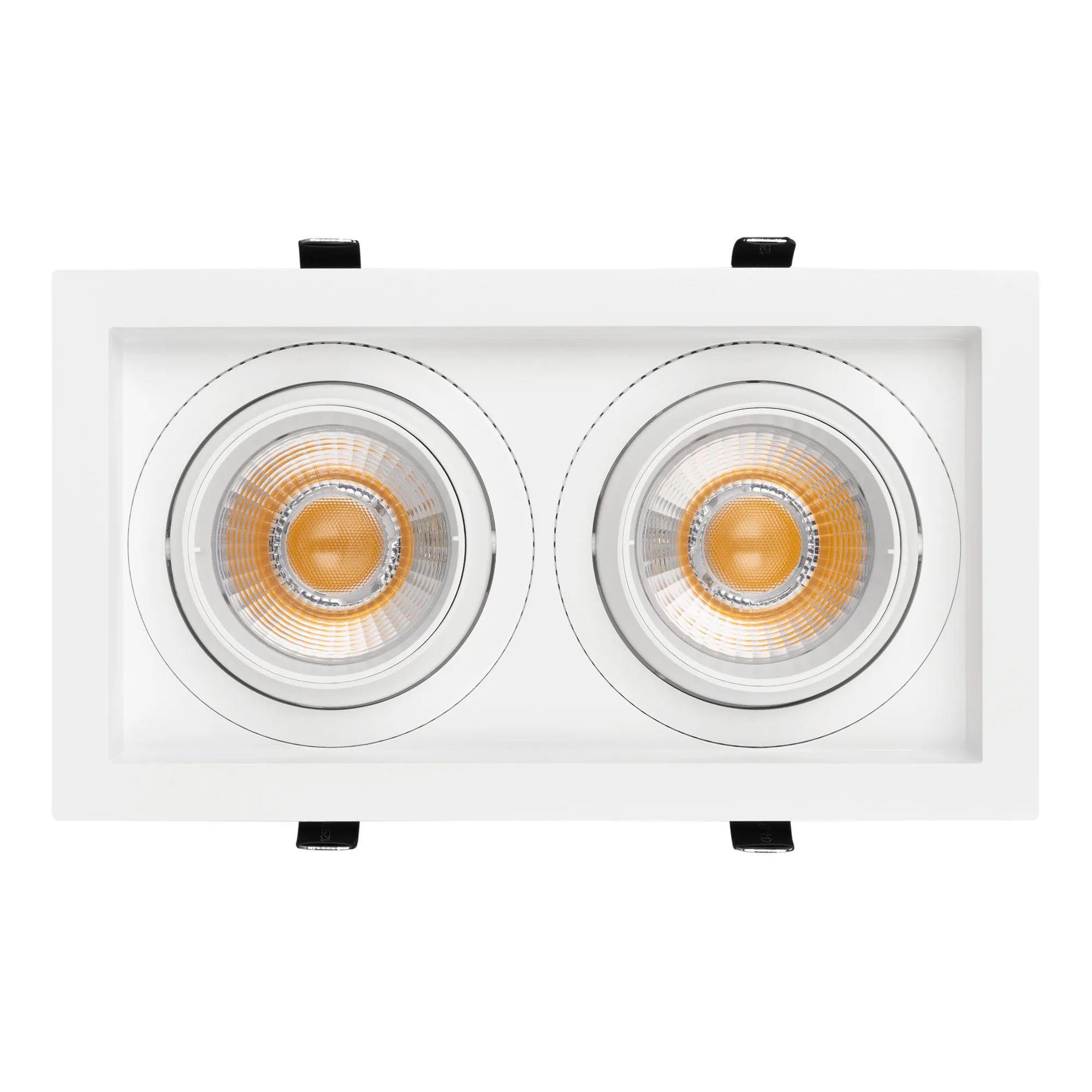 Встраиваемый карданный светильник. Мощность 2х30 Вт, св. поток 6520 лм, 109 лм/Вт, дневной 3000 K, CRI>92, угол 30°, напряжение питания 230 В. Белый корпус из алюминия, степень защиты IP20. Размер: длина 250 мм, ширина 140 мм, высота 125 мм. Монтаж встраиваемый, установочное отверстие: длина 230 мм, ширина 120 мм. Драйвер 24-42 В, 750 мА, пульсация <2%.