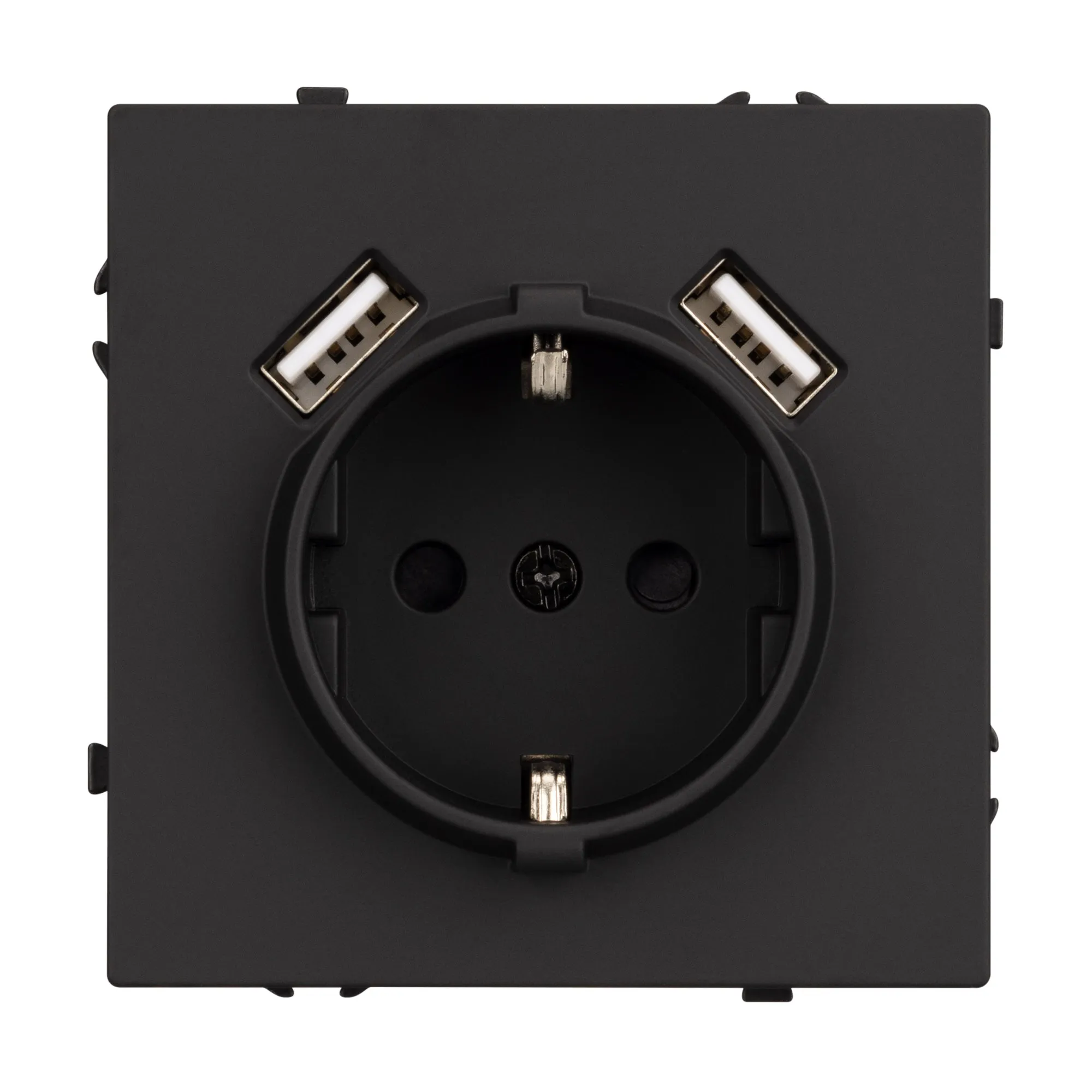 Механизм розетки с заземлением на 1 пост и 2USB Type A порта. Цвет - черный, с Soft-Touch покрытием. Без фронтальной рамки. Уровень пылевлагозащиты IP20. Розетка устанавливается в стандартный подрозетник круглого сечения диаметром 60мм.