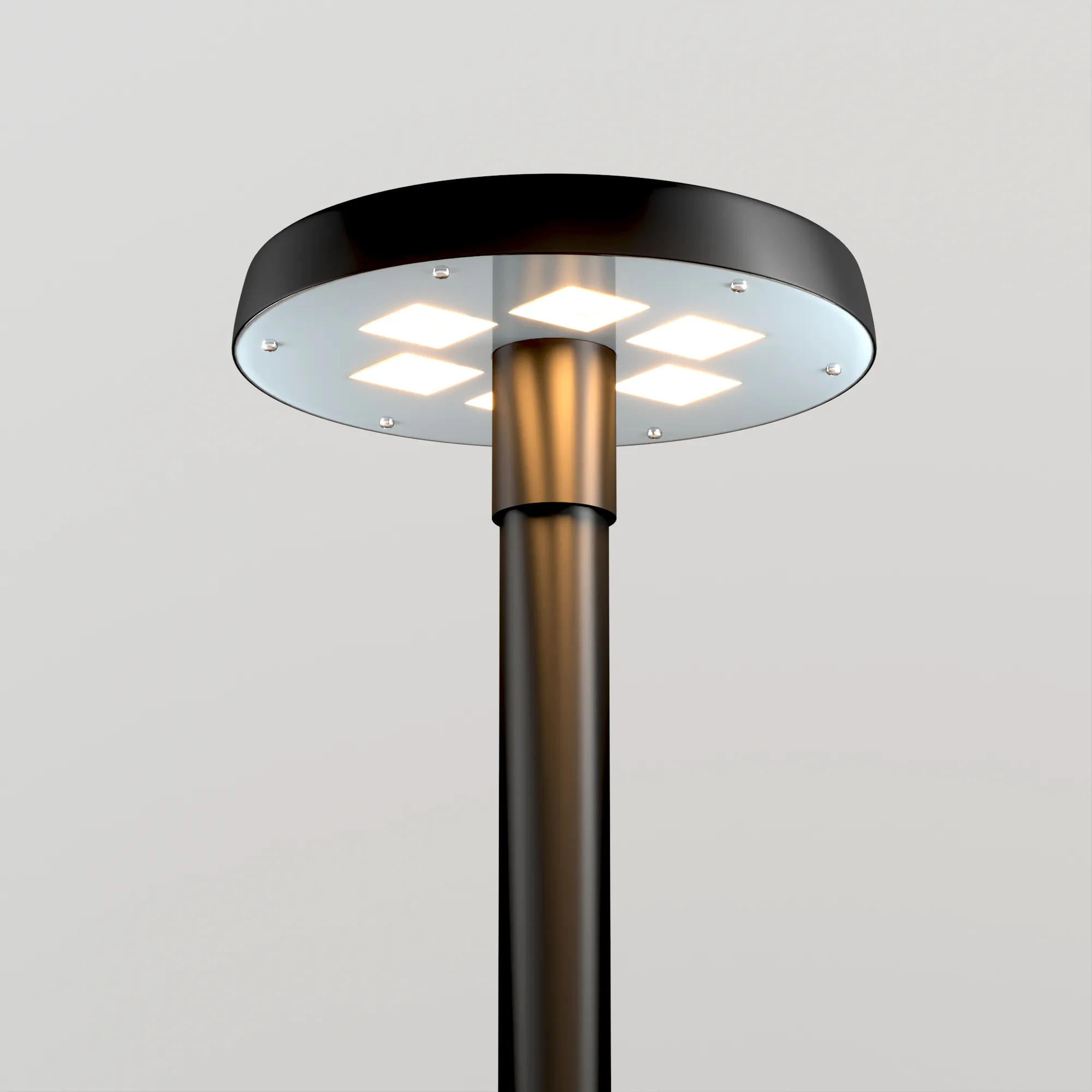 Венчающий светодиодный светильник. Мощность 50 Вт, св. поток 5680 лм, 112 лм/Вт, тёплый 3000 K, CRI>80, угол 140°, напряжение питания 230 В. Черный корпус из алюминия, экран закаленное стекло, степень защиты IP65. Размер: диаметр 510 мм, высота 200 мм. Монтаж на вертикальную опору диаметром 76 мкакой материал м.