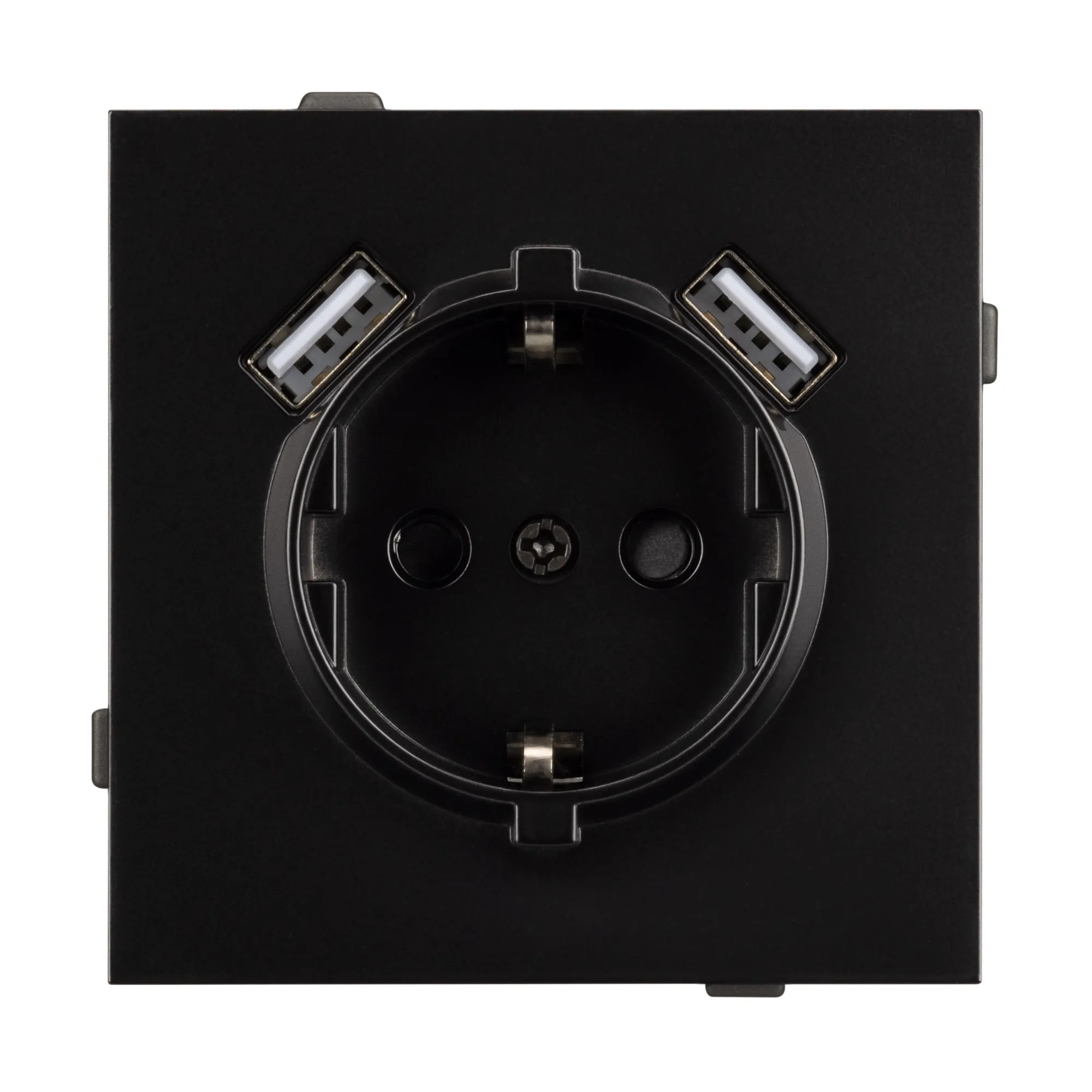 Механизм розетки с заземлением на 1 пост и 2USB Type A порта. Цвет - черный. Без фронтальной рамки. Уровень пылевлагозащиты IP20. Розетка устанавливается в стандартный подрозетник круглого сечения диаметром 60мм.