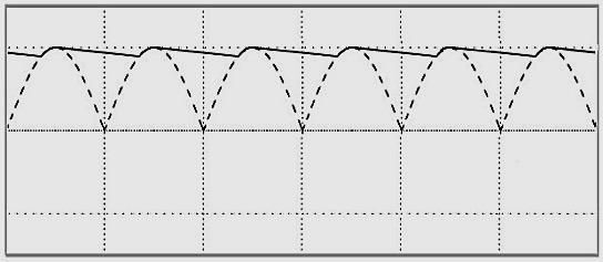 Первый блок – уже знакомый нам входной выпрямитель, который не имеет никаких отличий от выпрямителя, рассмотренного нами выше. С его выхода напряжение (см. Рис.2б) подается на сглаживающий фильтр, после которого приобретает форму, показанную сплошной линией на Рис.5.