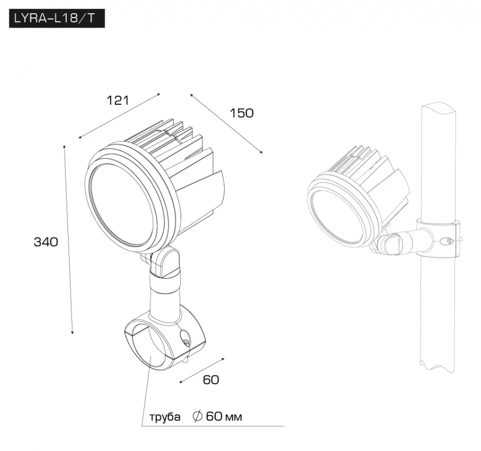 | 2 | LYRA-L18T | С креплением на трубу / 10°30°/60° | 18 Вт | 2610 Лм | 4000K / 3000K | 150*121*340 мм |