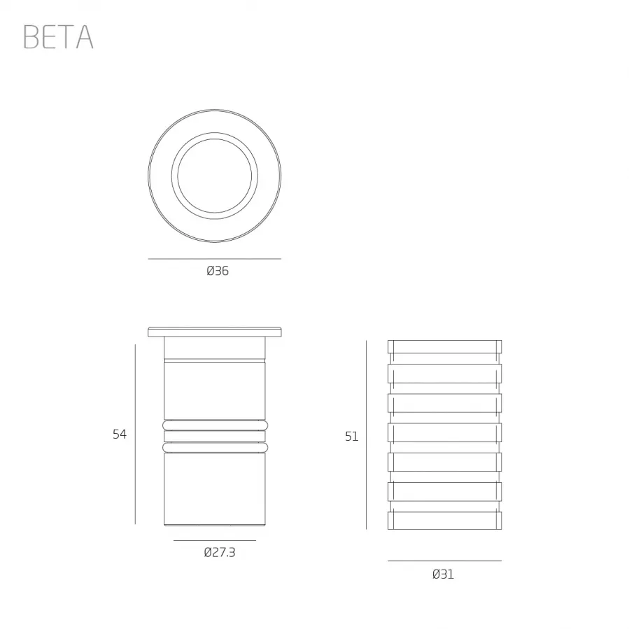 | 1 | Beta.3 | URG<19, RA>90, IP65, внешний источник тока IP44, 15°/25°/40° | 3 Вт | 435 Лм | 4000K/3000K | d36*54мм |