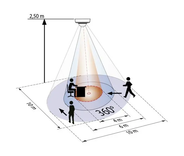 - Дистанционно управляемый потолочный датчик движения/шума для скрытого монтажа, с круговым диапазоном обнаружения