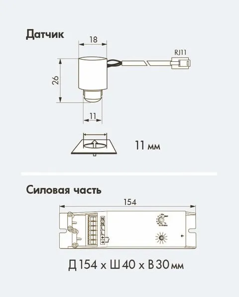 • Габариты Датчик: Ø 18 x В 26 мм. Силовая часть: Д 154 x Ш 40 x В 30 мм