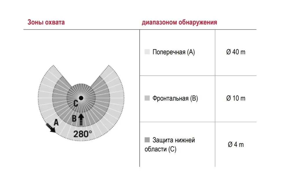 Угол обнаружения Защита нижней области обнаружения 280°
