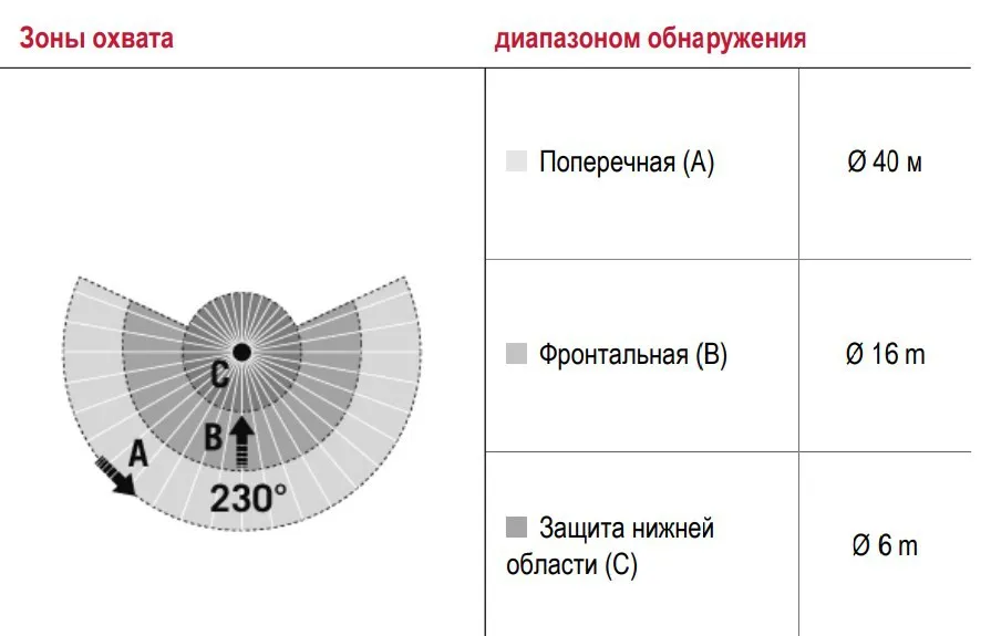 | Угол обнаружения | 230° (2 x 115°) + защита нижней области обнаружения 360° |