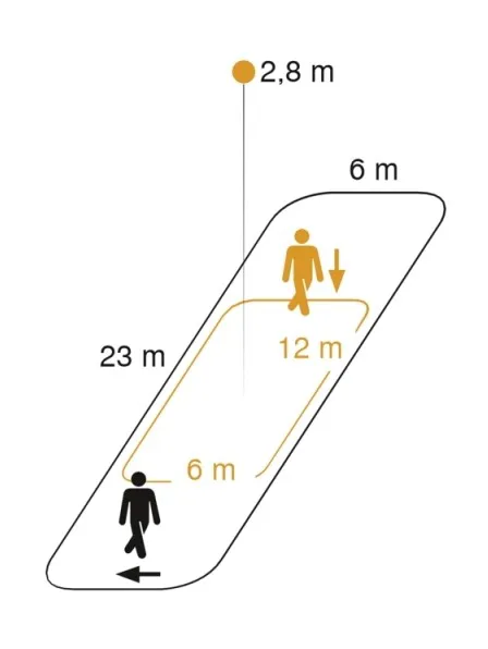 Проходы и длинные коридоры предъявляют особые требования к характеристикам датчиков. Зона обнаружения датчика должна быть узкой, но длинной. Только так минимальное количество датчиков может покрыть участки максимально возможной длины. Испытанный и проверенный снова и снова, IS 345 является специалистом для внутреннего применения этого типа. Он специально разработан для обнаружения в коридорах и имеет угол раскрытия 45 °. Это означает, что он может наблюдать за площадью до 23 х 6 метров по касательной.