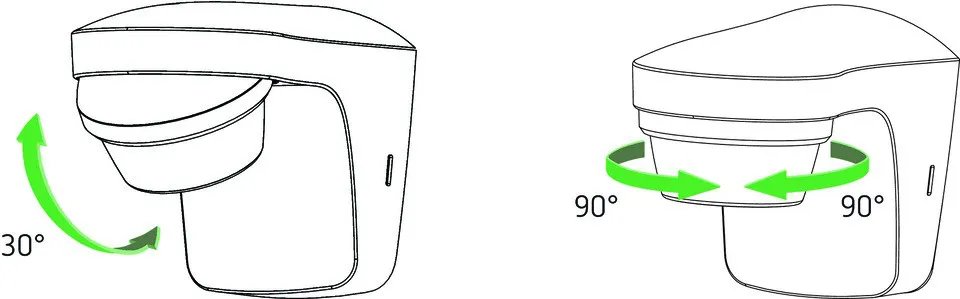 - Сенсорная головка датчика может быть повернута на ± 90° по горизонтале и на 30° вниз