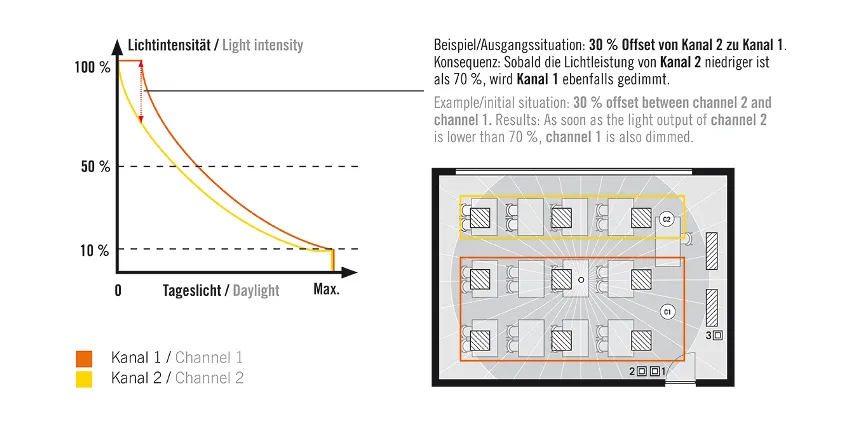 - Поддержание постоянного уровня освещенности в зависимости от присутствия людей и яркости дневного света