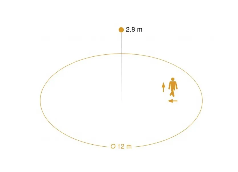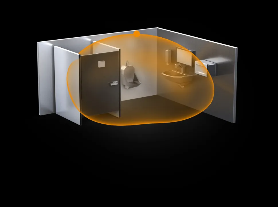Идеально подходит для санузлов, раздевалок, лестничных клеток, многоэтажных автостоянок, кухонь. Высота установки до 3,5 м, для включения и выключения освещения. Радиус действия - 1 - 12 м. Вылет регулируется с помощью электроники и может быть ограничен в двух направлениях, обнаружение независимо от температуры, технология HF-сенсора также обнаруживает движение сквозь стеклянные, деревянные перегородки.