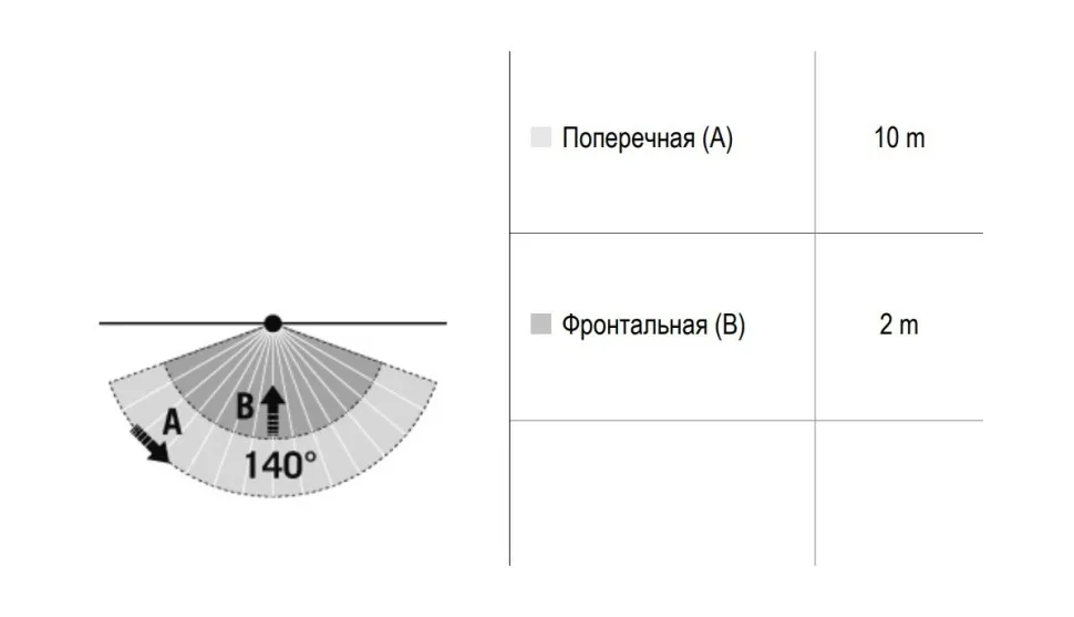 - Диапазон обнаружения 140°, дальность действия до 10 м при монтажной высоте 1,8 м