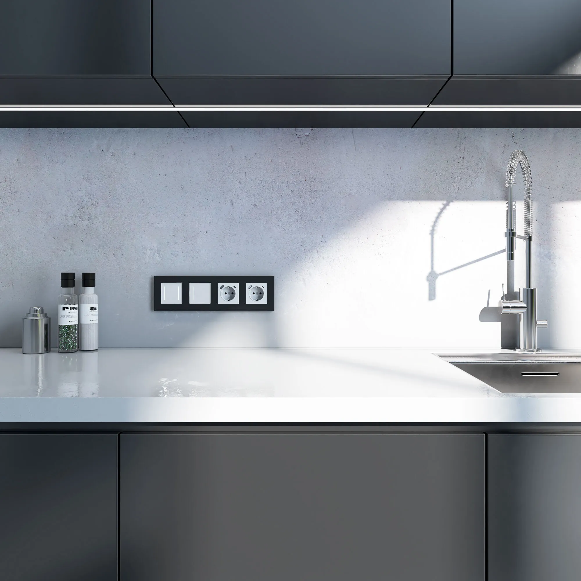 Серия Slab представлена моделями от одного до четырех постов. Рамки предназначены как для горизонтального, так и для вертикального монтажа. Коллекция совместима с любыми встраиваемыми механизмами Werkel.