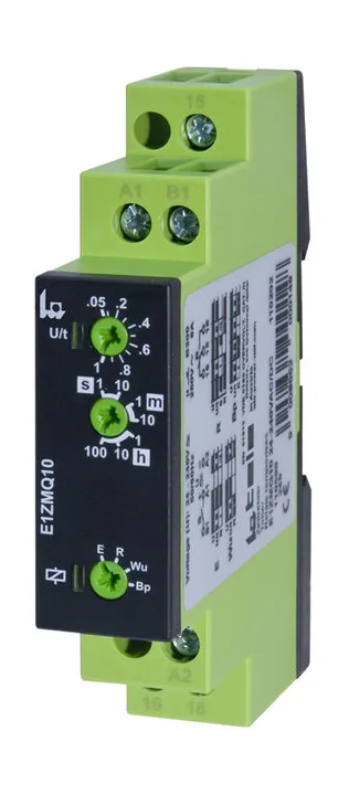 Реле времени - Задержка включения Задержка выключения с контактом управления ( R ) Напряжение питания U должно быть постоянно подано на реле времени (зеленый LED ВКЛ). При замыкании контакта управления S, выходное реле R замыкается (желтый LED ВКЛ). При размыкании контакта управления S начинается отсчет интервала времени t (зеленый LED мигает). По истечении интервала t (зеленый LED ВКЛ) выходное реле размыкается (желтый LED ВЫКЛ). При повторном замыкании контакта управления S до истечения интервала t цикл начнется сначала. Реле времени - Задержка выключения с контактом управления Формирование импульса при подаче напряжения питания ( Wu ) При подаче напряжения питания U выходное реле R замыкается (желтый LED ВКЛ) и начинается отсчет заданного интервала t (зеленый LED мигает). Реле времени - Формирование импульса при подаче напряжения питания Генератор импульсов начиная с паузы (циклическое реле) ( Bp ) При подаче напряжения питания U начинается отсчет заданного интервала t (зеленый LED мигает). По истечении интервала t, выходное реле R замыкается (желтый LED ВКЛ) и снова отсчитывается заданный интервал t, по истечении которого выходное реле R размыкается (желтый LED ВЫКЛ). Цикл повторяется с соотношнением импульс-пауза 1:1 пока не будет прервана подача напряжения питания. Реле времени - Генератор импульсов начиная с паузы (циклическое реле) Схема подключения E1ZMQ10 24-240VAC/DC Габаритный чертеж E1ZMQ10 24-240VAC/DC